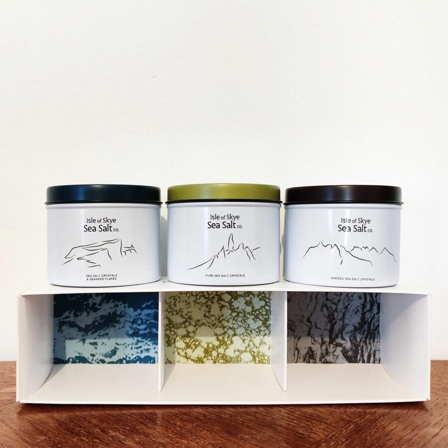 This pocket tasting set contains Iconic Isle of Skye Sea Salt trio : Pure Sea Salt, Smoked Sea Salt and a Sea Salt & Seaweed blend. A true Skye tasting experience in 120g aluminium tins for your daily cooking!