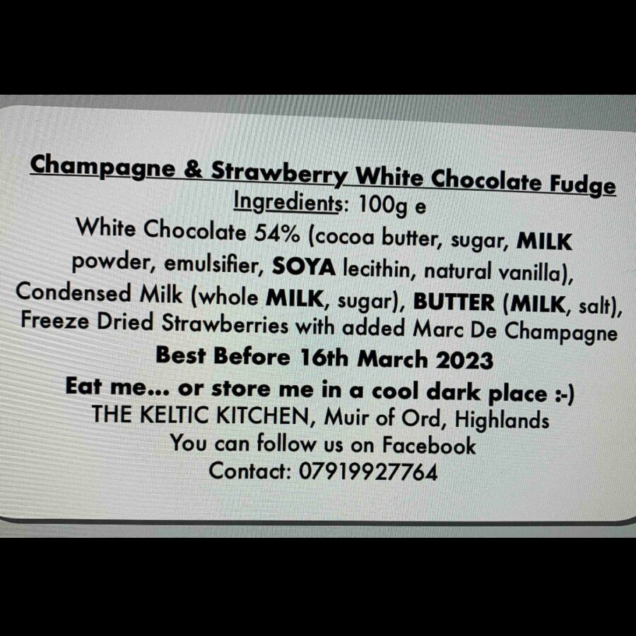 Ingredients : White Chocolate 54% (cocoa butter, sugar, MILK powder, emulsifier: SOYA lecithin, natural vanilla), condensed MILK (whole MILK, sugar), BUTTER (MILK, salt), freeze dried strawberries with added Marc de Champagne.