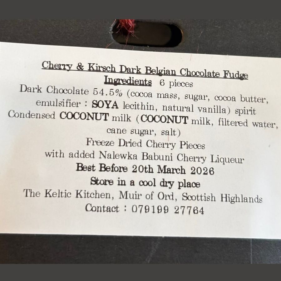 Ingredients : Dark Chocolate 54.5% (cocoa mass, sugar, cocoa butter, emulsifier: SOYA lecithin, natural vanilla), condensed COCONUT milk (COCONUT cream, filtered water, cane sugar, salt), spirit, freeze dried cherry pieces with added Nalewka Babuni cherry liqueur.