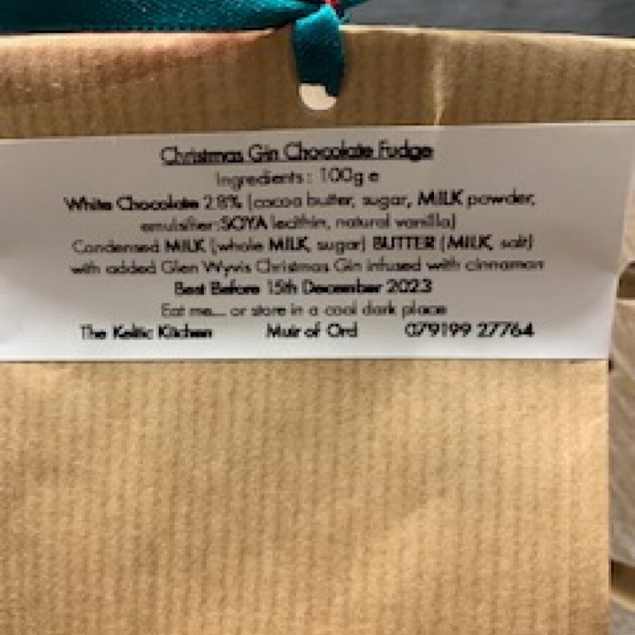 Ingredients : White chocolate 28% (cocoa butter, sugar, whole MILK powder, emulsifier, SOYA lecithin, natural vanilla), condensed milk (whole MILK, sugar), BUTTER (MILK, salt), with added Christmas Gin infused with cinnamon.