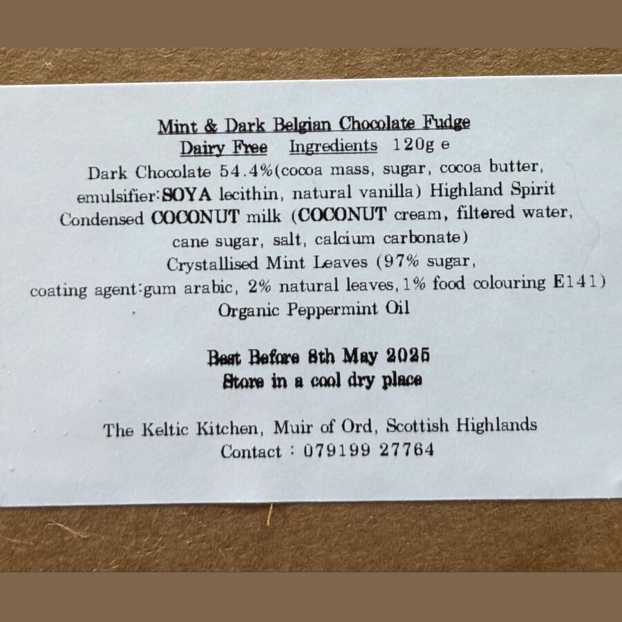 This vegan fudge is made using Organic Peppermint Oil, dark Belgian chocolate and Coconut Milk making for a very indulgent combination. Perfect for an after dinner treat. All Keltic Kitchen's dark chocolate fudge is dairy free and suitable for a Vegan diet.