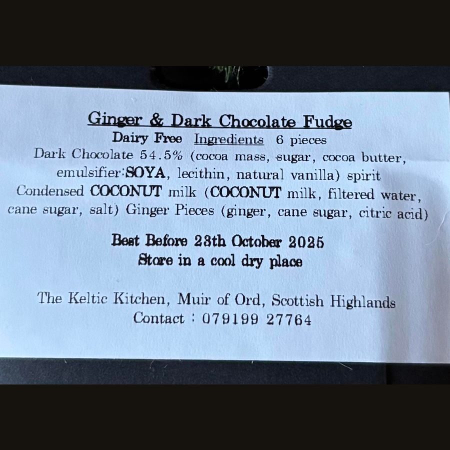 A delicious dark chocolate fudge with ginger. This fudge is dairy free and so can be enjoyed by all.