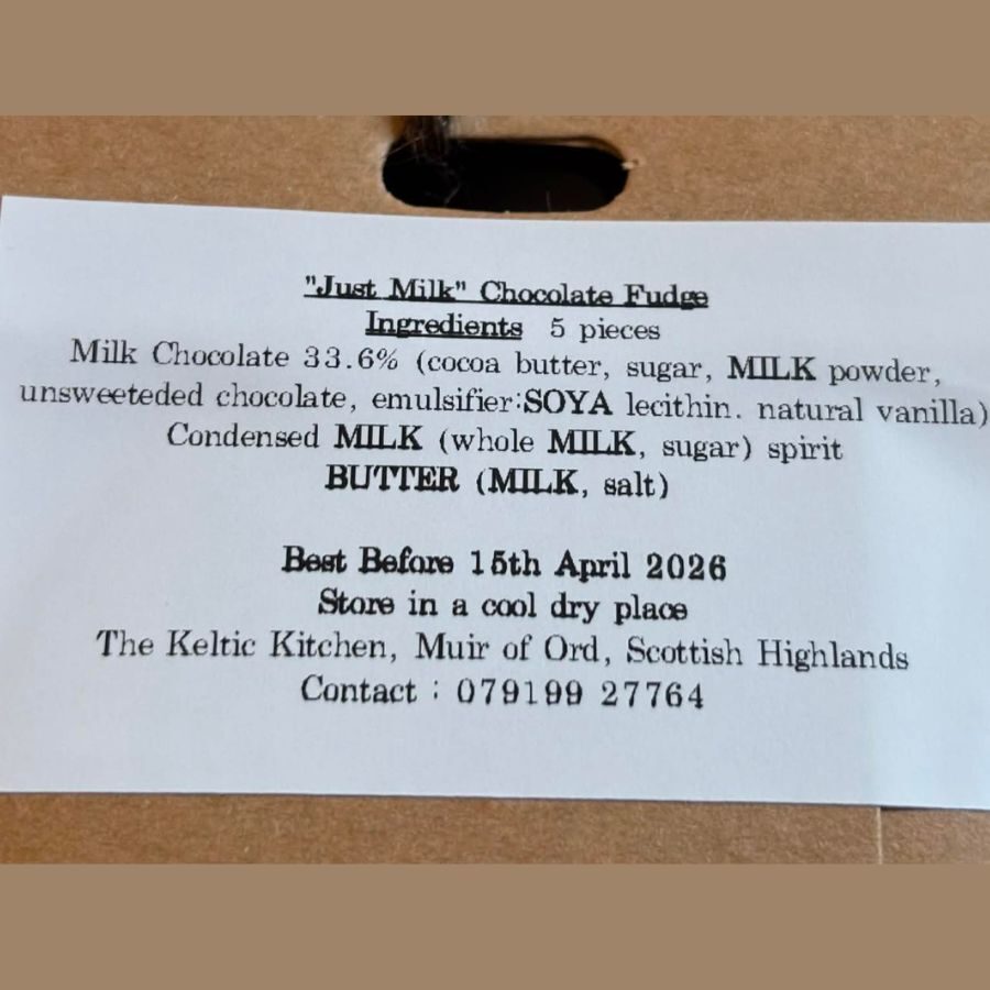 Ingredients: Milk Chocolate 33.6% (cocoa butter, sugar, whole MILK powder, unsweetened chocolate, SOYA lecithin, natural vanilla), condensed MILK (whole MILK, sugar), butter (MILK, salt), spirit.