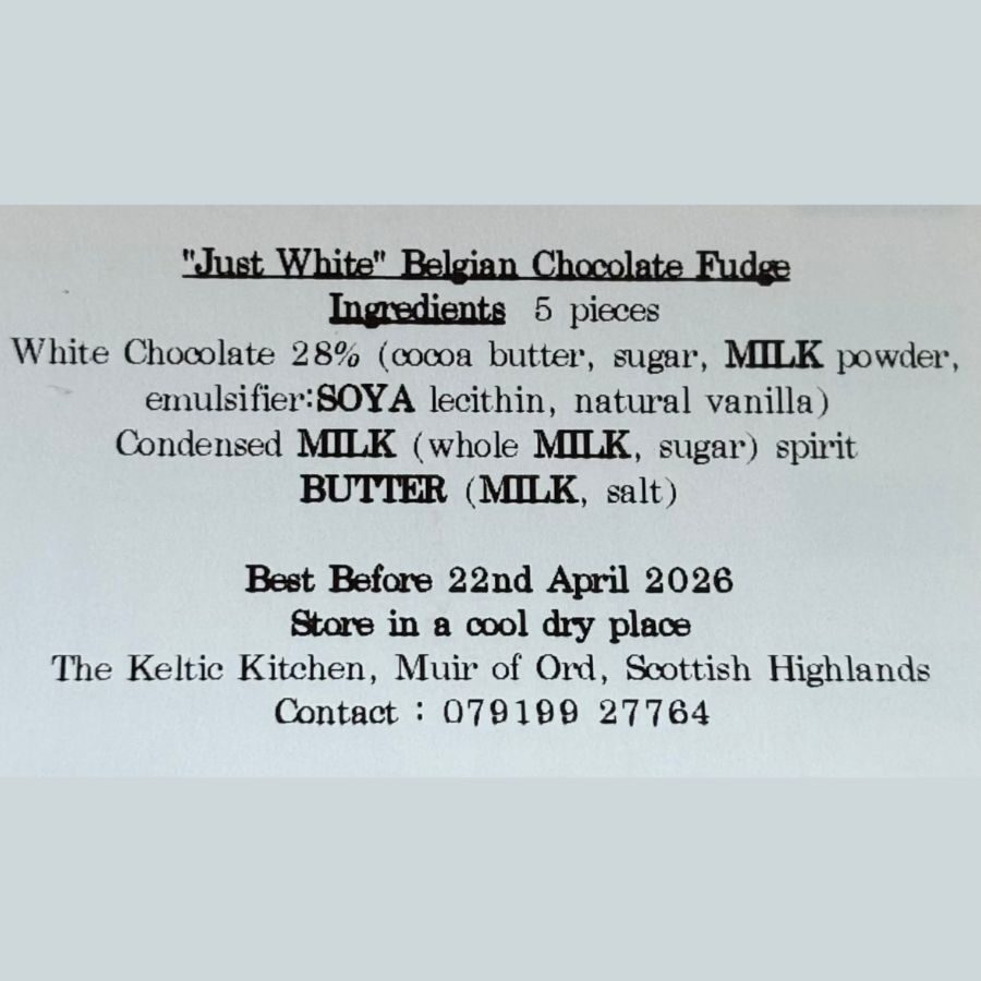 Ingredients: White Chocolate 28% (cocoa butter, sugar, MILK powder, emulsifier, SOYA lecithin, natural vanilla), Condensed milk (whole MILK, sugar), BUTTER (MILK, salt), spirit.