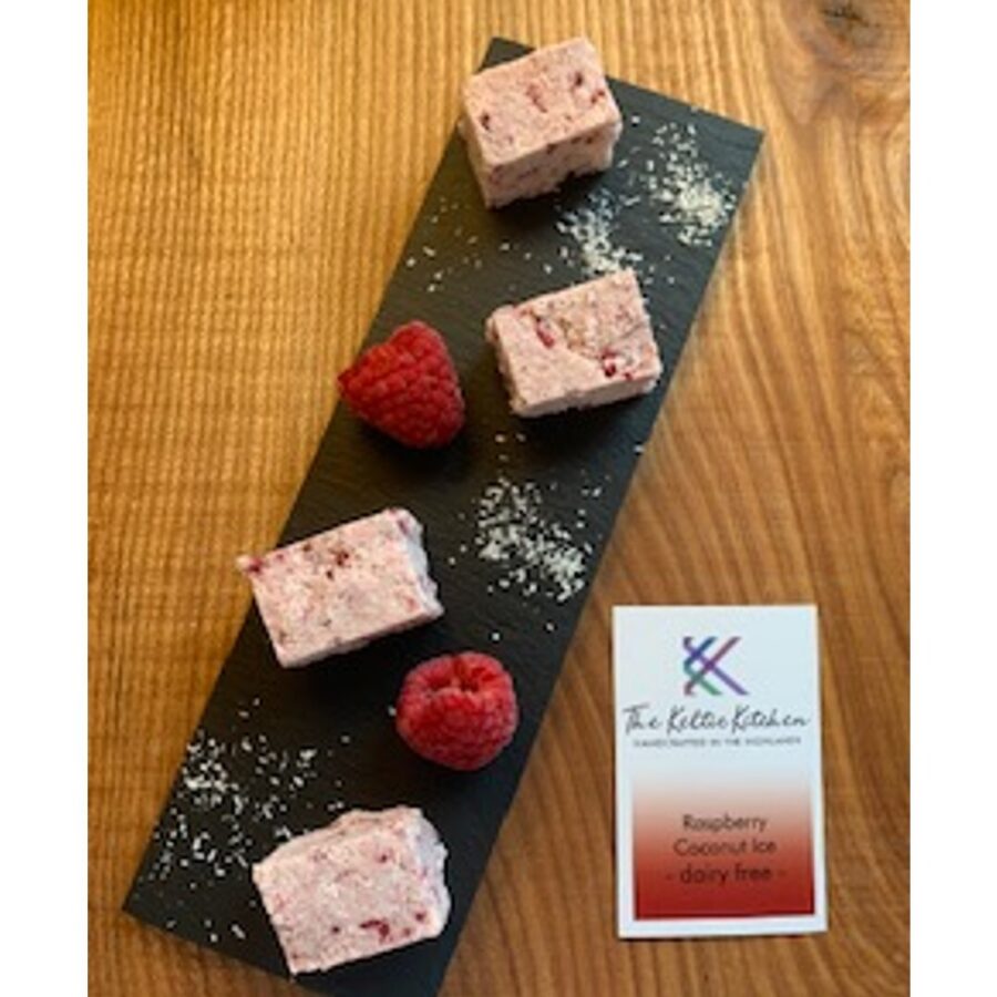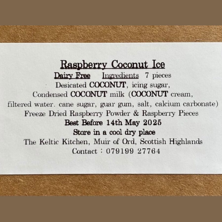 Part of the Keltic Kitchen's Signature Christmas Boxes! Delicious coconut ice with freeze dried raspberry pieces. Dairy Free.