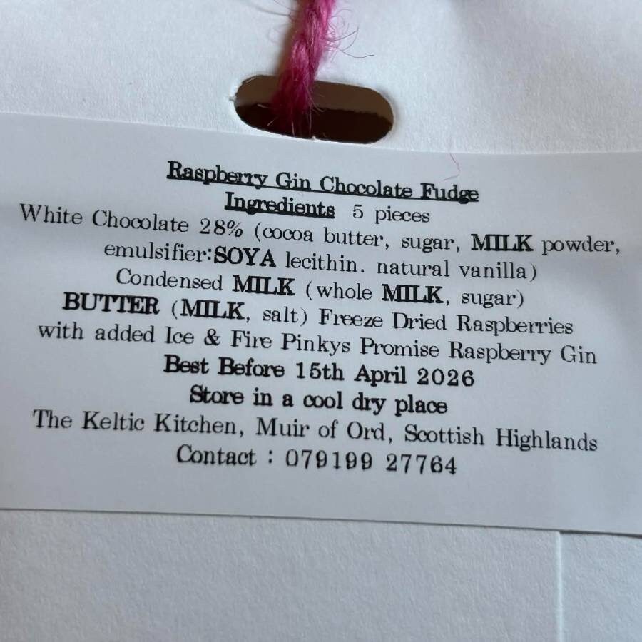 Ingredients: White Chocolate 28% (sugar, cocoa butter, MILK powder, emulsifier, SOYA lecithin, natural vanilla) Condensed MILK (whole MILK, sugar) BUTTER (MILK, salt), Freeze dried raspberries with added Ice & Fire Pinky Promise Raspberry Gin.