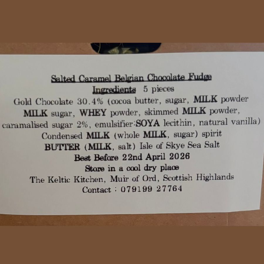 Ingredients: Gold Chocolate 30.4% (cocoa butter, sugar, MILK powder, MILK sugar, whey powder, skimmed MILK powder, caramelised sugar 2%, emulsifier, SOYA lecithin, natural vanilla, salt) Condensed MILK (whole MILK, sugar) BUTTER (MILK, salt), Isle of Skye Sea Salt.