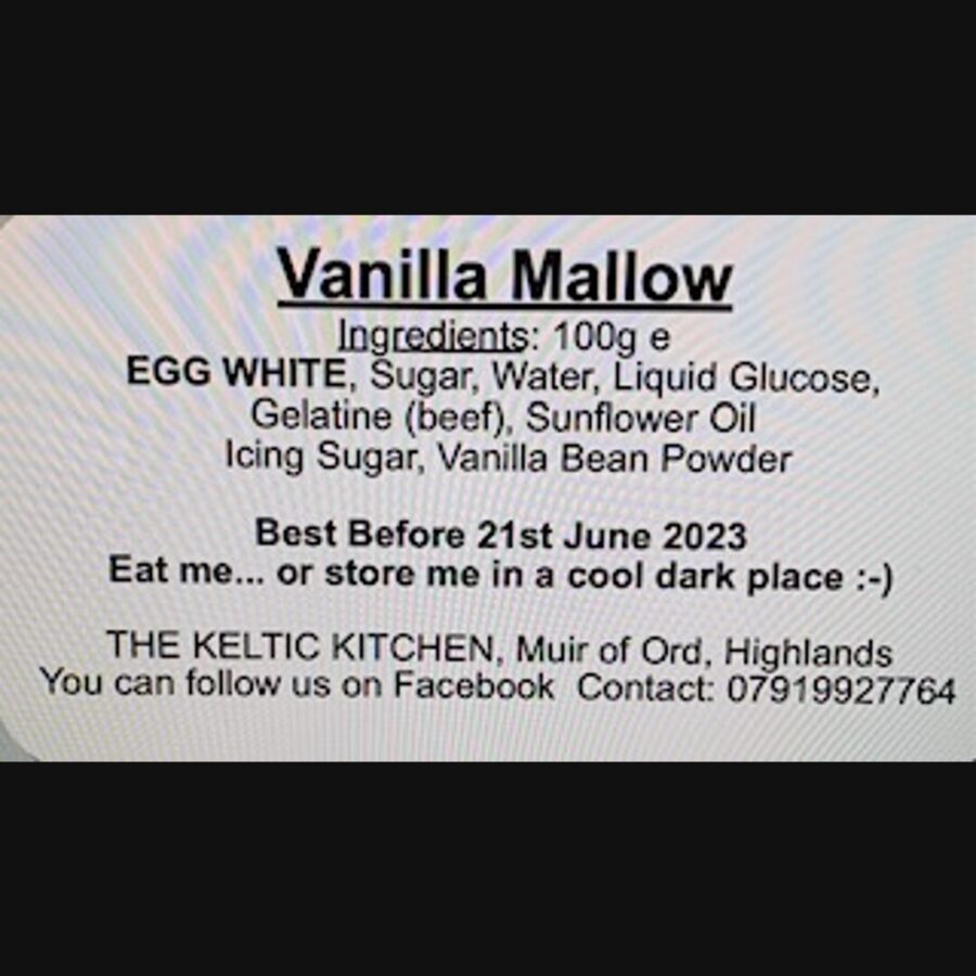 Ingredients: EGG WHITE, sugar, liquid glucose, gelatine (beef), sunflower oil, icing sugar, vanilla bean powder.