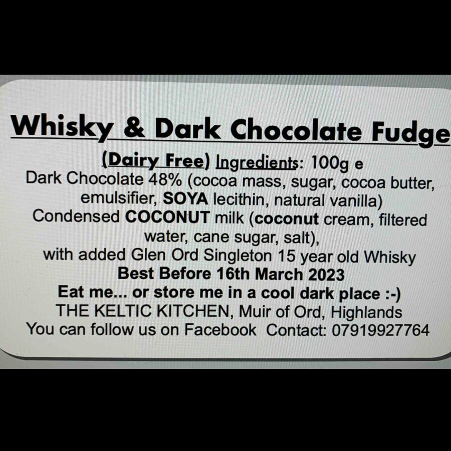 A delicious combination of dark chocolate fudge and a local Glen Ord 15year old Singleton. It is completely dairy free so everyone can enjoy it.
