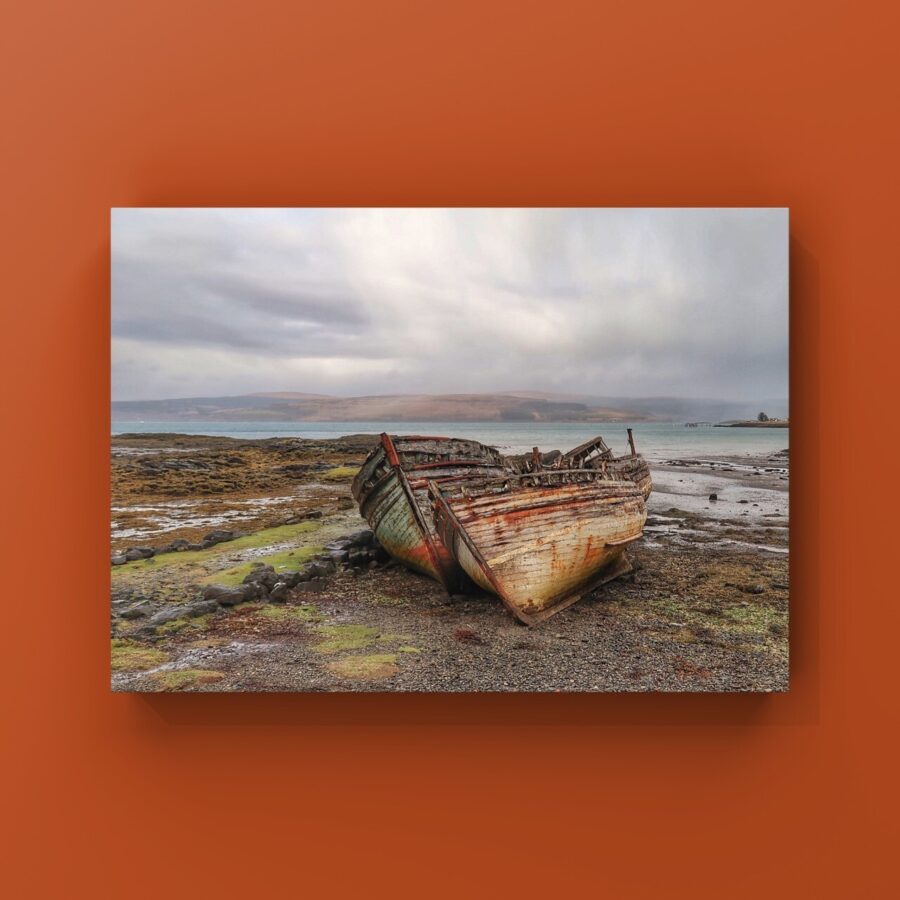 A matte aluminium print with hanging system of Boats - Isle of Mull. Not framed.