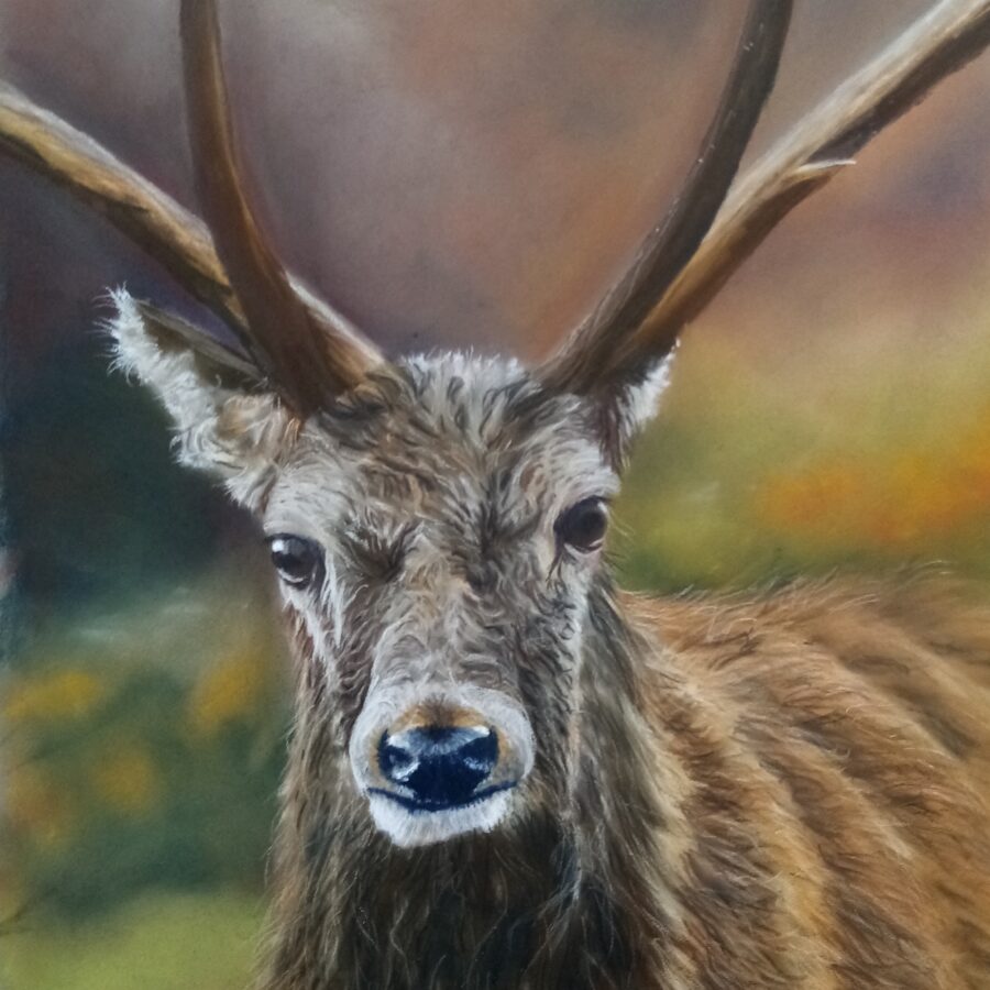 A beautiful pastel painting of a Highland Stag, from image courtesy of Sandra Whyte. Double mounted on backing board ready to frame and protected with glassine paper when posted. It can fit 30cm x 41cm frame.