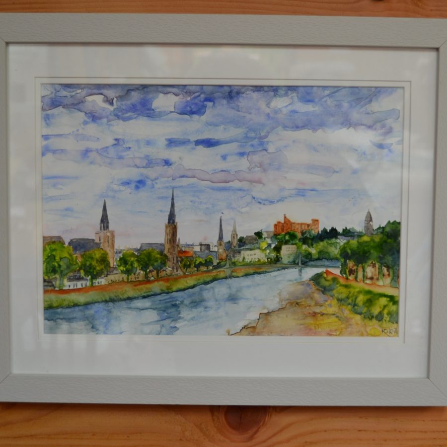 Watercolour of Inverness. Mounted with backing; painted on yupo. Please note frame is not included.