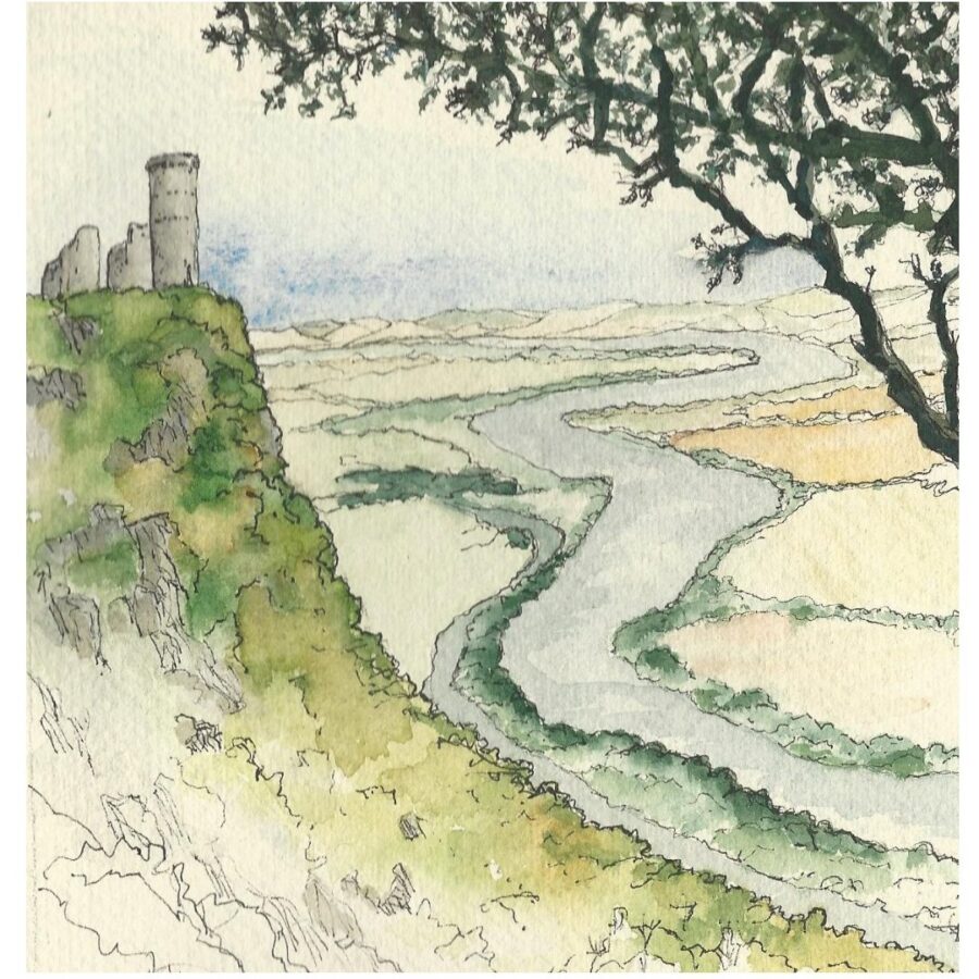 A framed painting of Kinnoull Tower and the River Dee in pen and watercolour ready to hang.