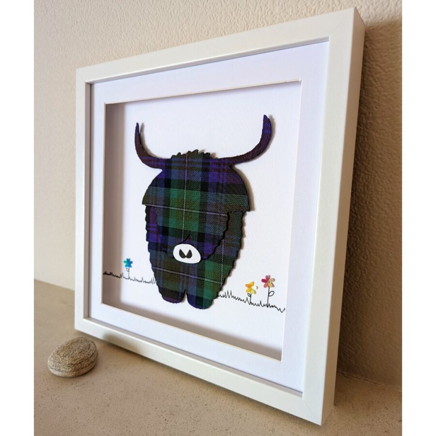 Meet Henrietta Coo! Lovingly designed and handmade by Ula, from genuine Isle of Skye tartan. In this large version, Henrietta is sitting on a simple, hand drawn background, with cute sequin flowers. Each picture is slightly different due to the nature of the tartan and the colour of the sequins. The frame is chunky so you can stand the picture on a surface as well as hanging it on a wall. Henrietta Coo also comes in a small version (10cm) and is available in a choice of three frame colours (black, white and grey). NB. Avoid placing the picture in direct sunlight.