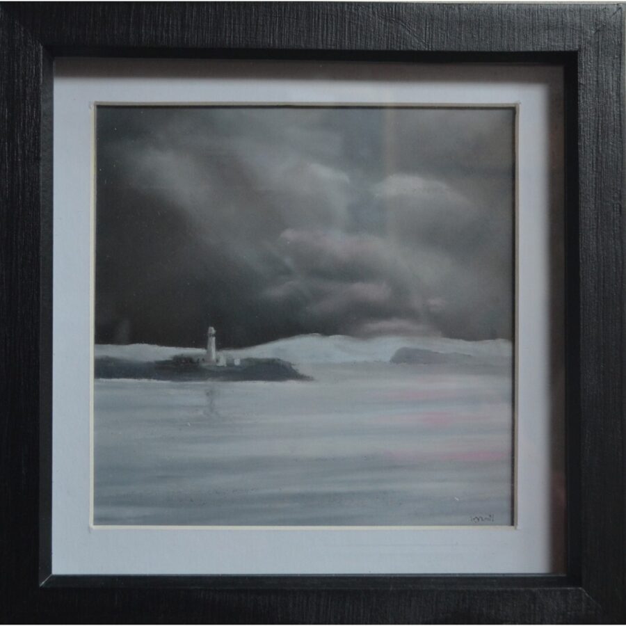 A framed painting of Lismore Lighthouse by Mull in pastel ready to either hang or stand.