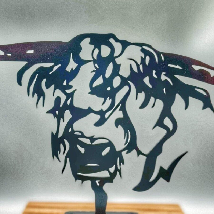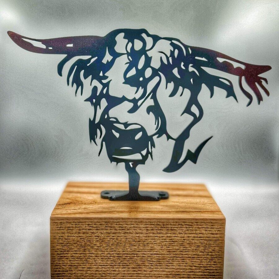 A delightful metal Highland cow sculpture produced in steel from sketches by Ian Williams.