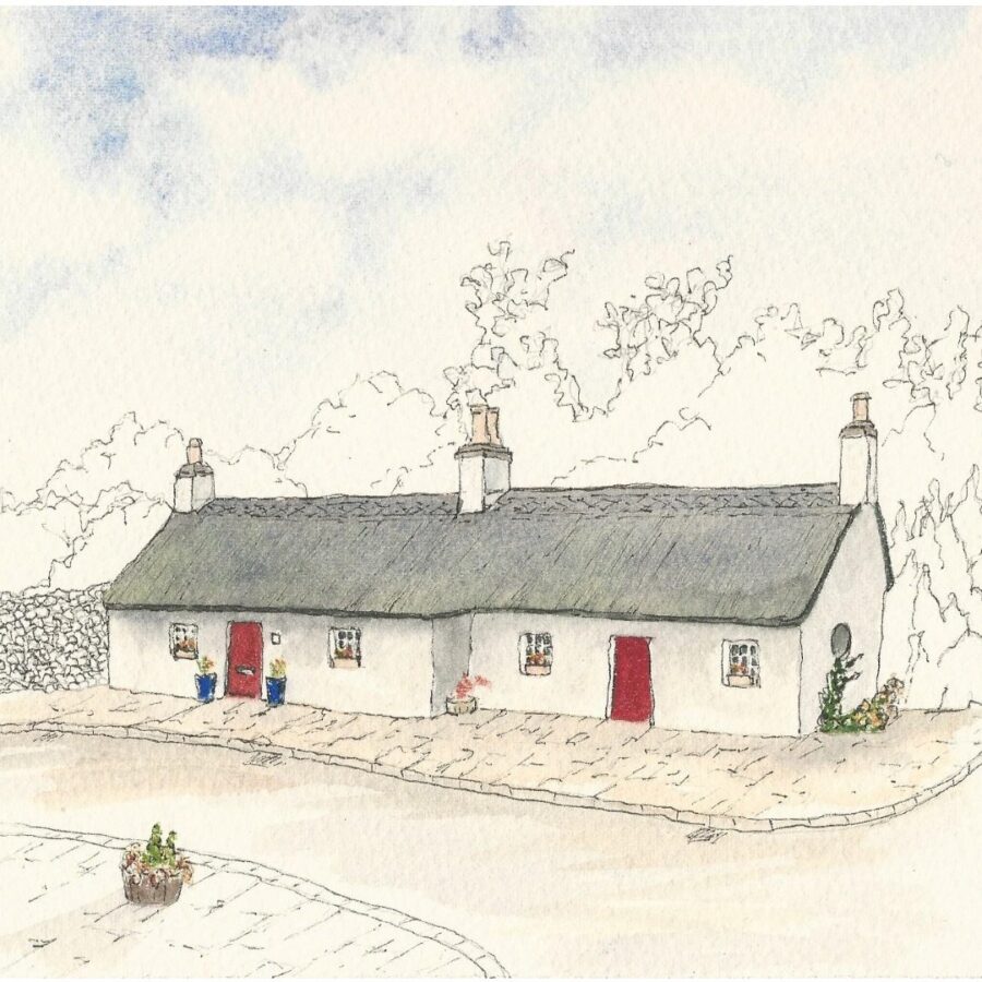 A framed painting of an old cottage in Glamis, Perthshire in pen and watercolour ready to either hang or stand.