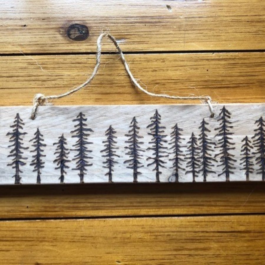 Fire drawn wall art on upcycled wood, with Hessian string to hang it.