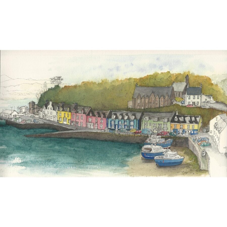 An unframed painting of Portree, Skye in watercolour and pen. This comes on a backing board but will need a mount and frame.