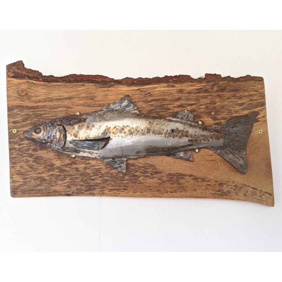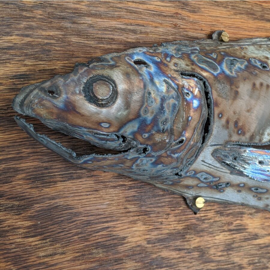 Recycled dishwasher stainless steel salmon on a locally sourced native hardwood mount. Hand cut and welded using cutting equipment and every piece is unique with some amazing colours and surface textures being developed from the heat treatment used. Each piece, unless it is stainless steel, is then lacquered to lock in the surface patina and gives a durable protective finish.