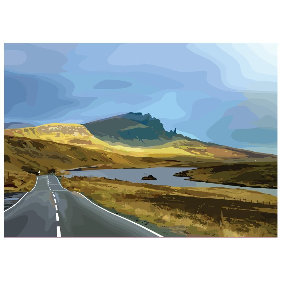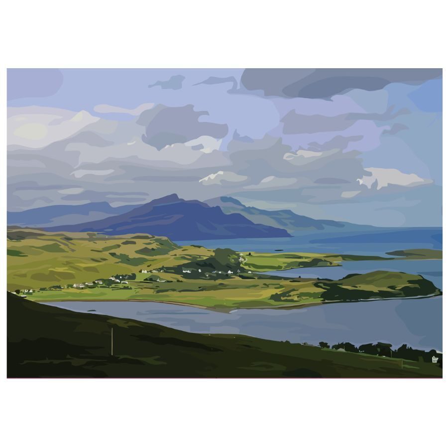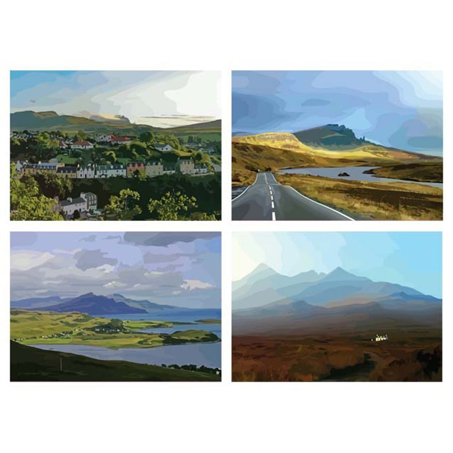 A pack of 4 vectorised photo images. Images in this pack are Portree, the road to the Old Man of Storr, Trotternish from Glamaig and Allt Dearg & the Cuillin Ridge. The images are all photographs Elaine has taken but they have been vectorised giving them a contemporary twist. The prints are A5 (approx 15cm x 21cm) or A4 (approx 21cm x 30cm) and are printed on 350gms silk card.