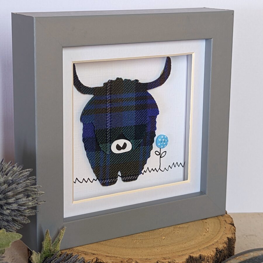 Meet Henrietta Coo! Lovingly designed and handmade by Ula, from genuine Isle of Skye tartan. In this small version, Henrietta is sitting on a simple, hand drawn background, with tiny button flowers. Each picture is slightly different due to the nature of the tartan and the colour of the buttons. The frame is chunky so you can stand the picture on a surface as well as hanging it on a wall. Henrietta Coo also comes in a large version (25 cm) and is available in a choice of three frame colours (black, white and grey). NB. Avoid placing the picture in direct sunlight.