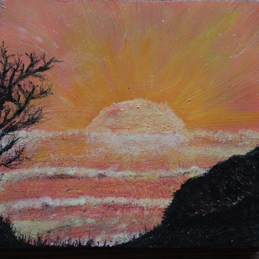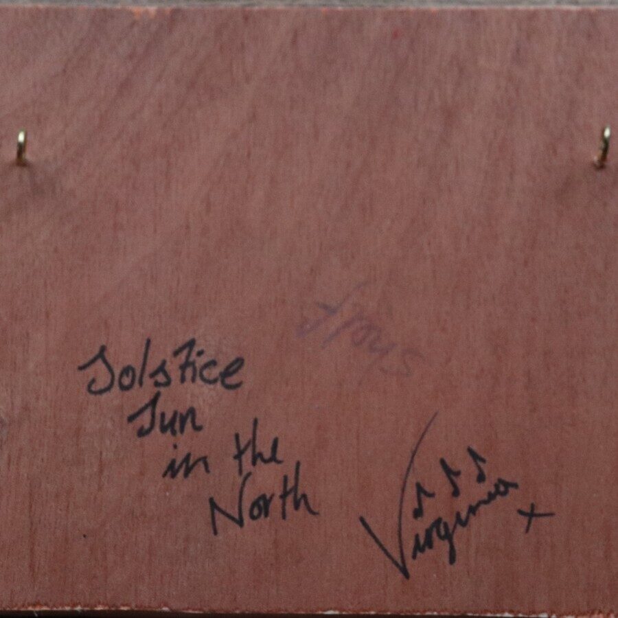 Solstice Sun in the North is an acrylic on Plywood - an offcut of wood from a bookshelf. This comes with eyelets ready to be hung.