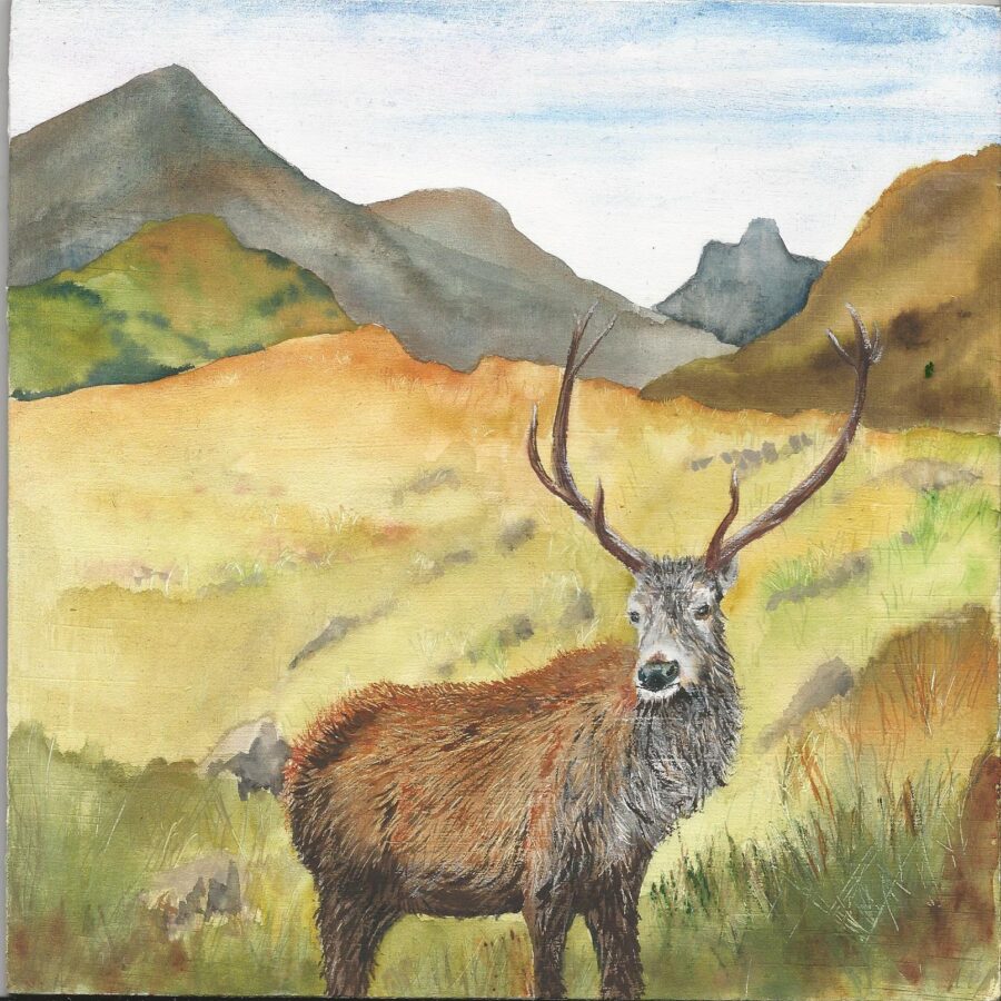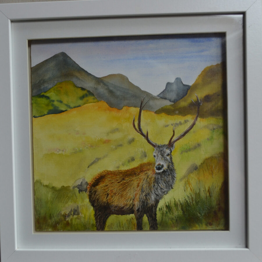 A framed painting of a stag in watercolour on a wooden panel ready to hang (image courtesy of Sandra Whyte).