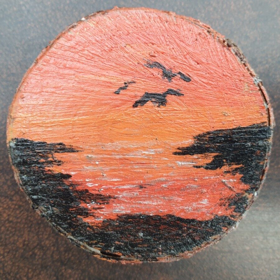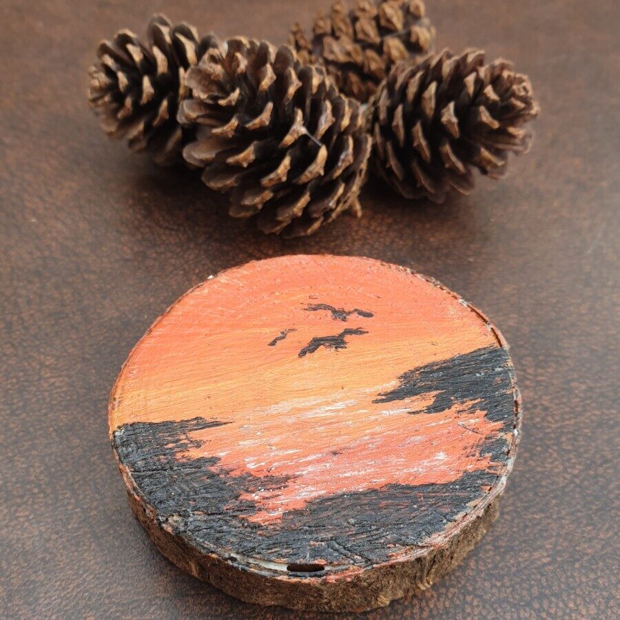 Sunset Flight is an acrylic painting on a piece of spruce - this wood was sourced from our own wood at Stempster, Caithness. Part of the Whimsical Paints collection.