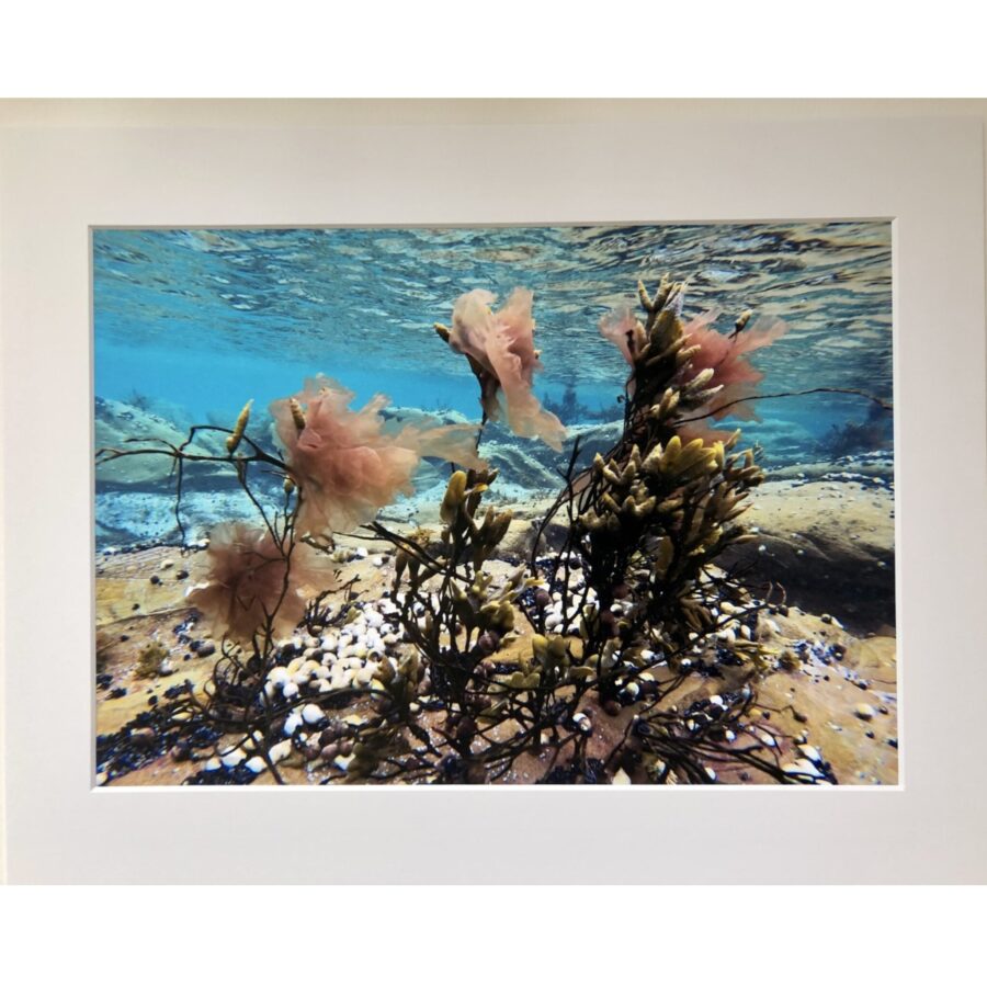 An underwater photo print from Gulberwick beach, Shetland. A4 photo print, mounted to fit into a standard frame size 11 x 14 inch. The photos are professionally printed with a lustre finish, they come sealed in a cello pouch.