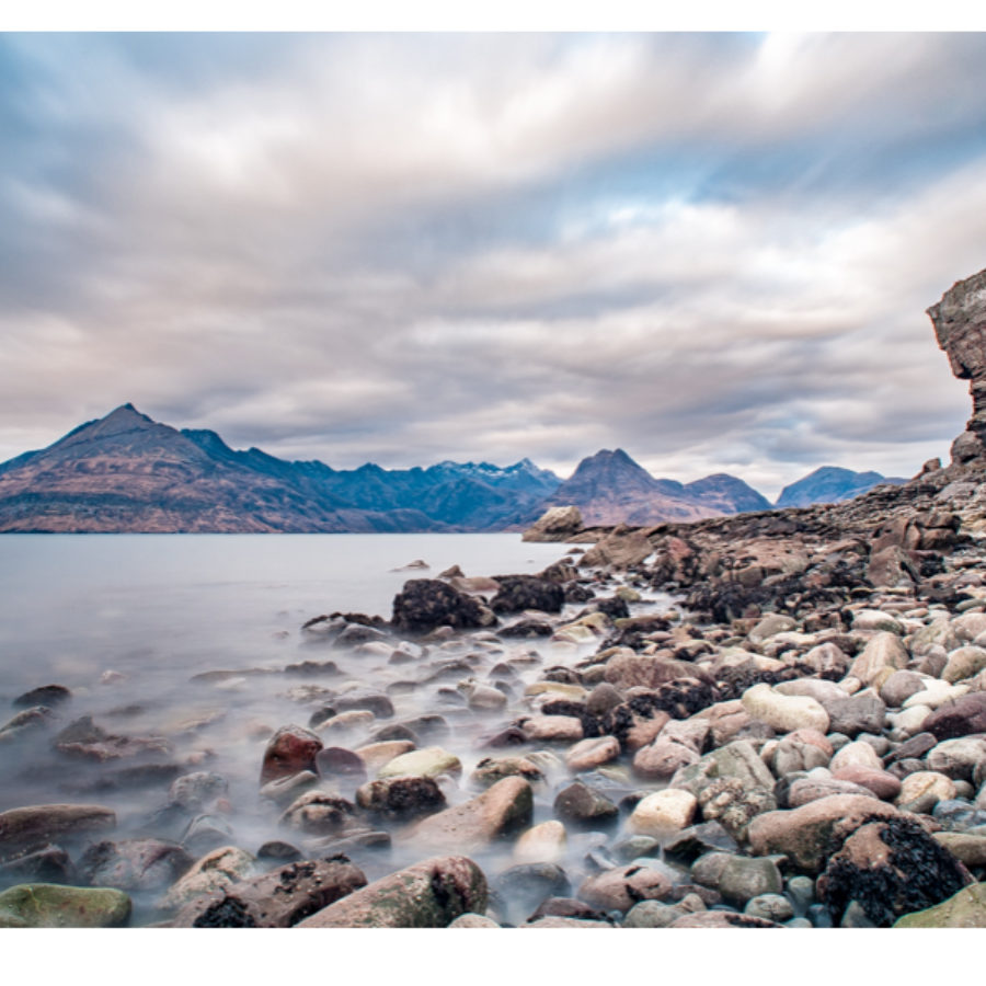 The Cuillins from Elgol Beach. Colour print with backing board, wrapped in cellophane. Available in different sizes - A4, A3, A3+. Choose your size in the dropdown on ordering.