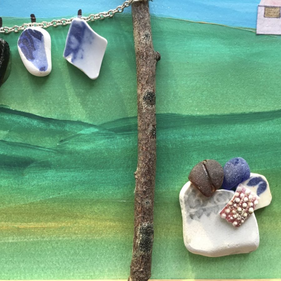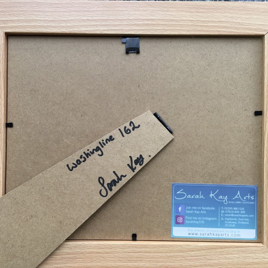 Washing lines made from Shetland Island beach treasures. The line is a recycled necklace chain and the posts are driftwood sticks ( not easy to find in Shetland with no trees!). Each one is different with a hand painted background. They are signed and numbered.