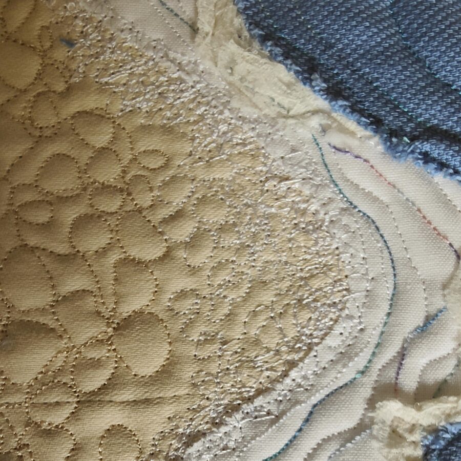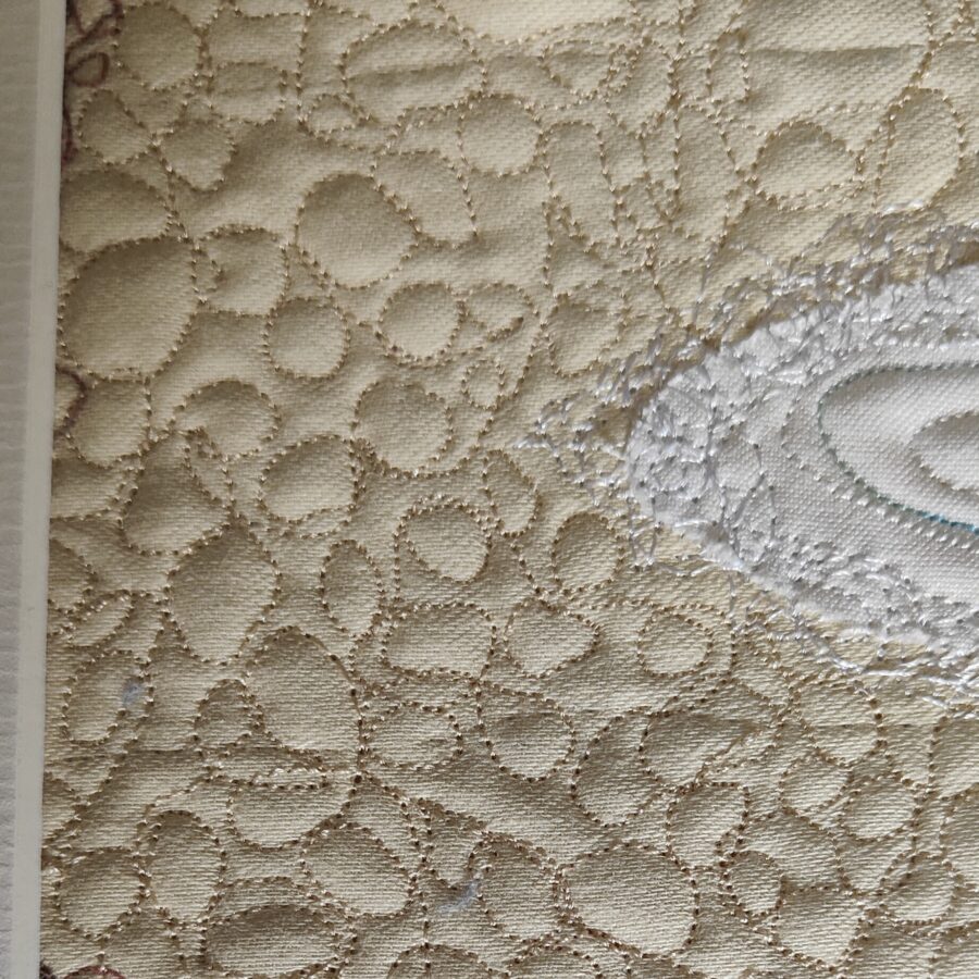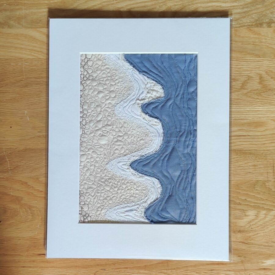 “Waves” is a detailed aerial picture of waves against the shore, featuring extensive free motion embroidery and various textured materials. Sold in a standard 16 x 12 inch premium mount. This standard size fits many readily available frames.