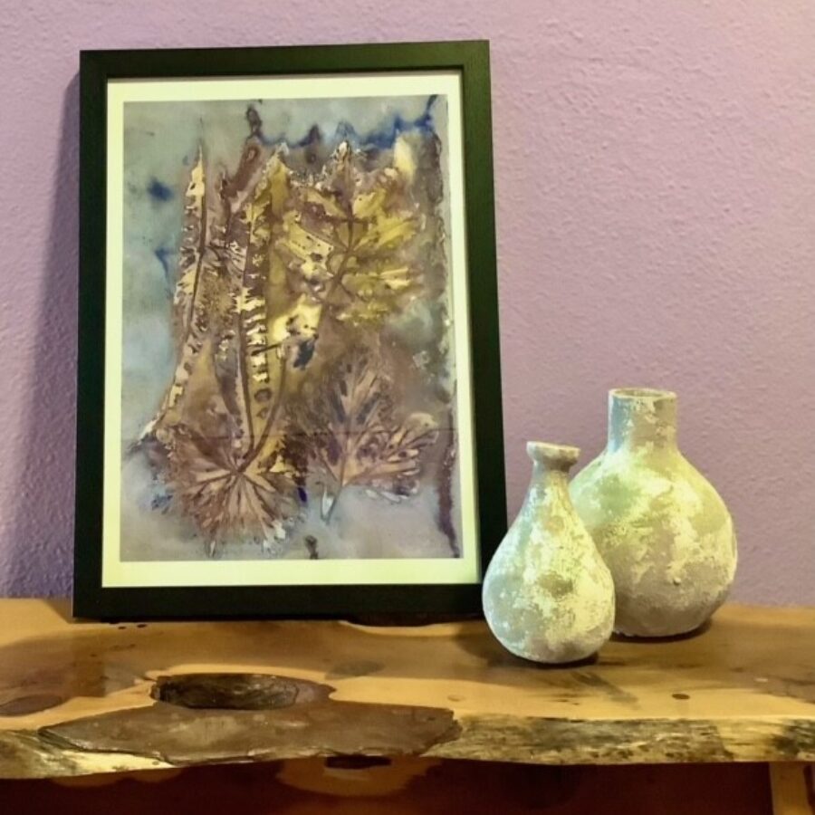 A eco print made with leaves. The maker finds the process very rewarding and she never knows how things will turn out! These are “Giclee“ printed which is a superior quality print process used in fine art as it gives a beautiful clarity of detail. The paper used is also superb quality “cotton smooth”. As framing art is a matter of individual taste these prints are not framed and posted rolled in a cardboard tube protected. Price includes UK postage.