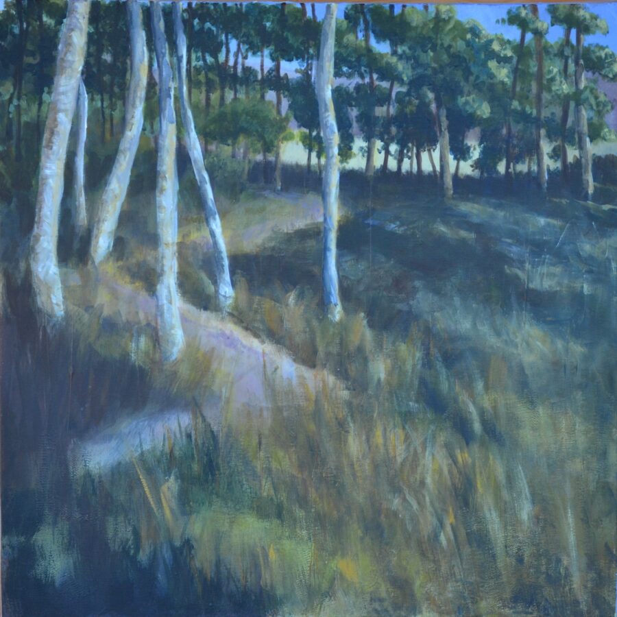 An acrylic painting of the woods at Tarland in Aberdeenshire on a box canvas. Strung and ready to hang.