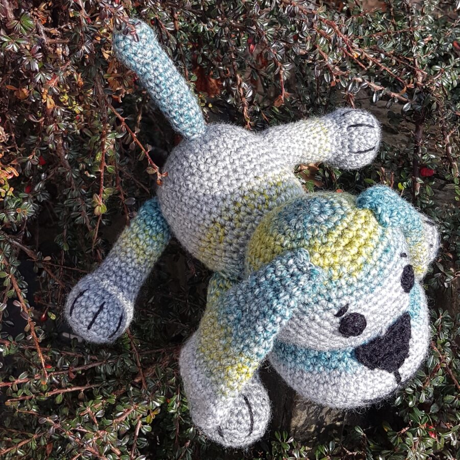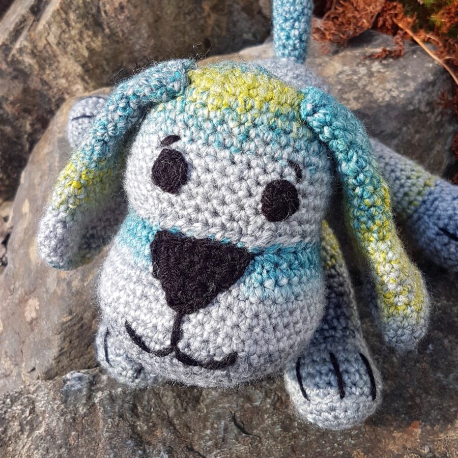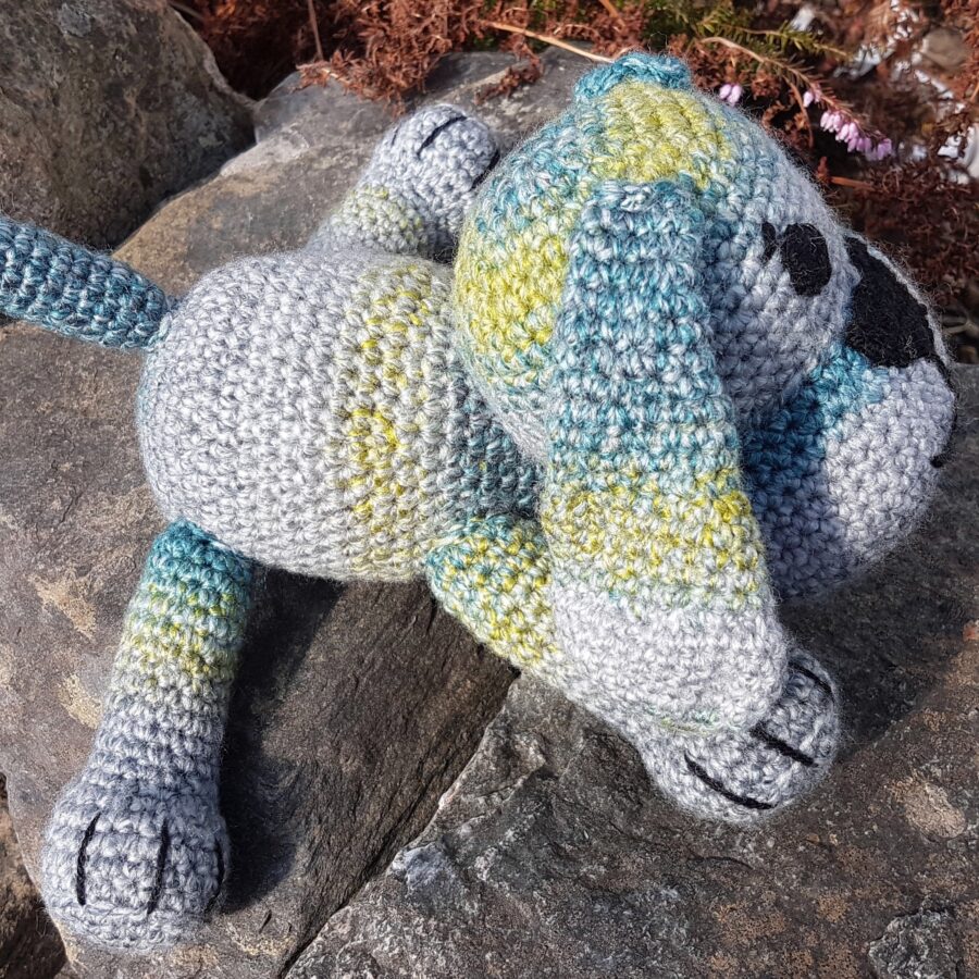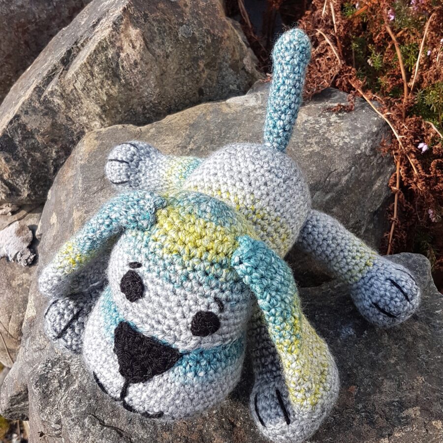Angus is crochet in a lovely variegated grey/yellow/green acrylic yarn and has crochet black eyes & muzzle. Each puppy is unique in name as well as colours. Angus is approx. 30 cm tall and 15 cm high. This would be a lovely gift for anyone between 0-100.