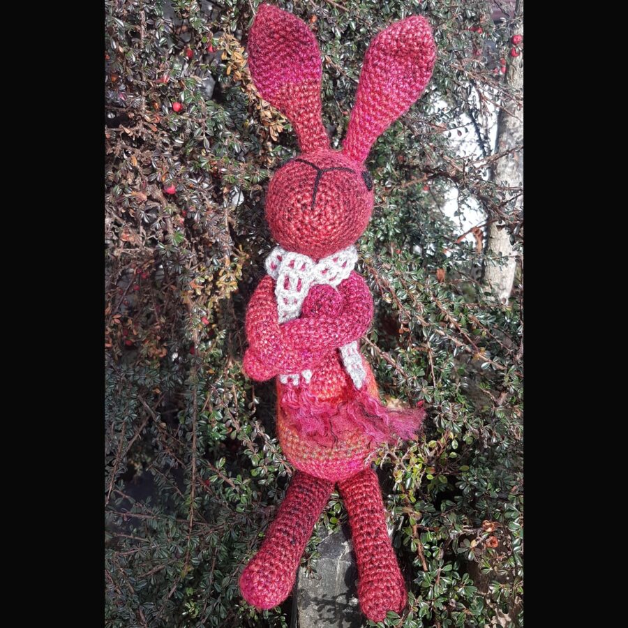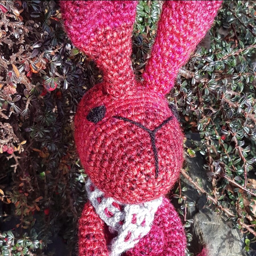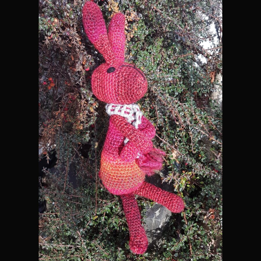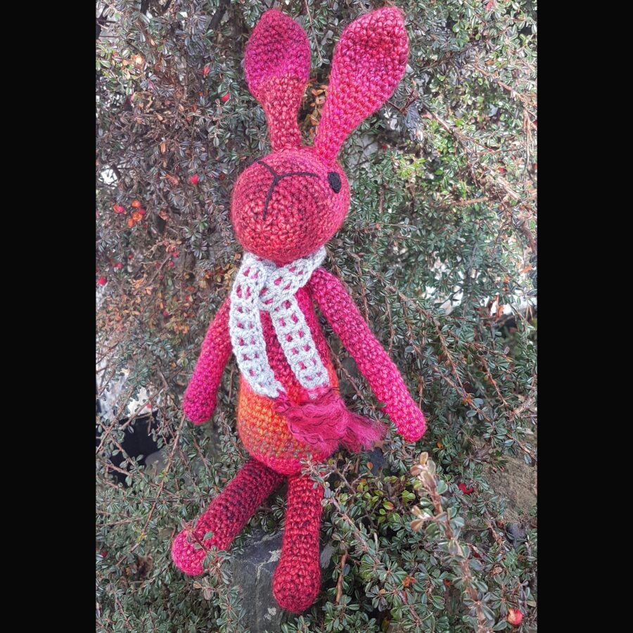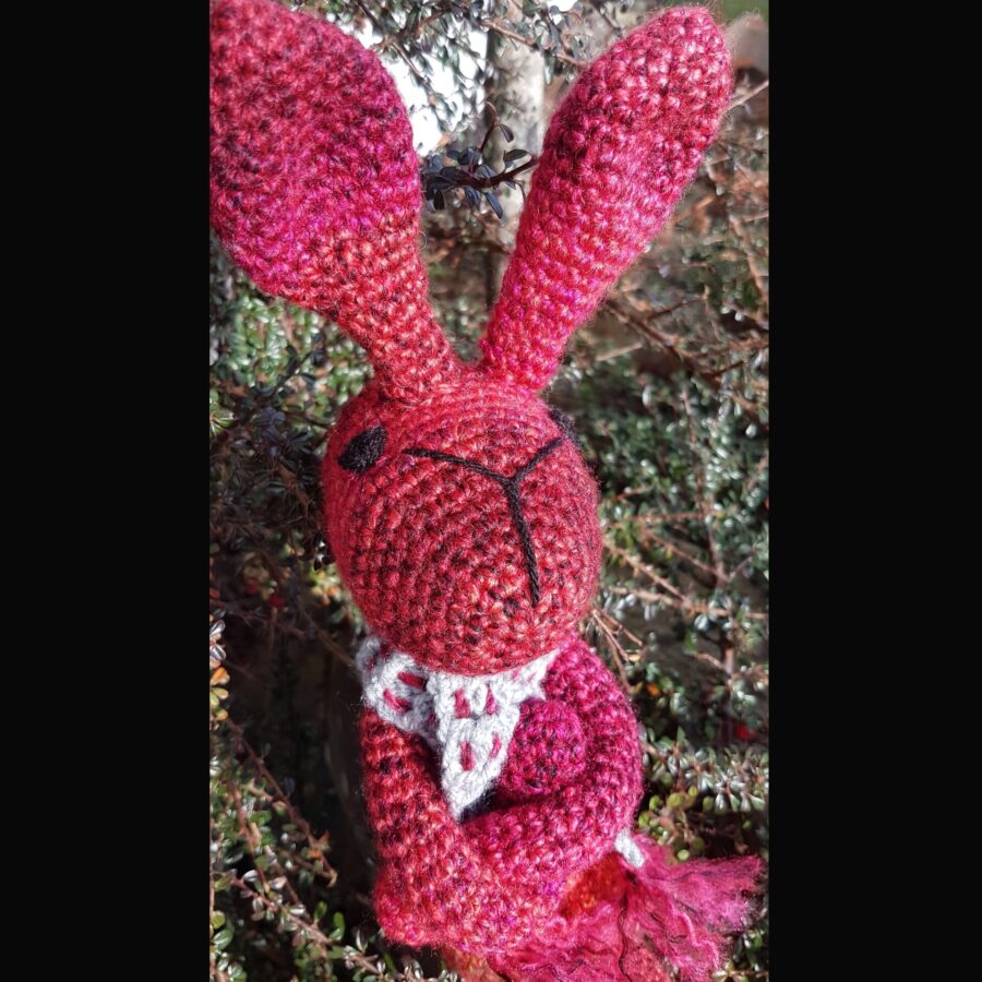 Annabel is crochet in a lovely variegated red acrylic yarn and has crochet black eyes. She also wears a long grey scarf. Each bunny is unique in name as well as colours. Annabel is 45cm tall and can sit upright by herself. This would be a lovely gift for anyone between 0-100.