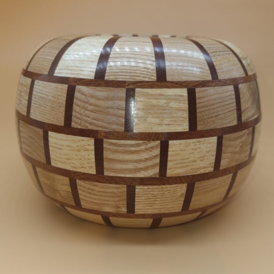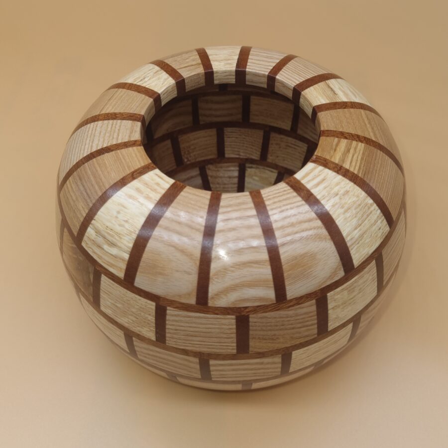 A beautiful ash, elm and mahogany segmented vase finished with Danish oil and then polished with wax for a deep long lasting shine.