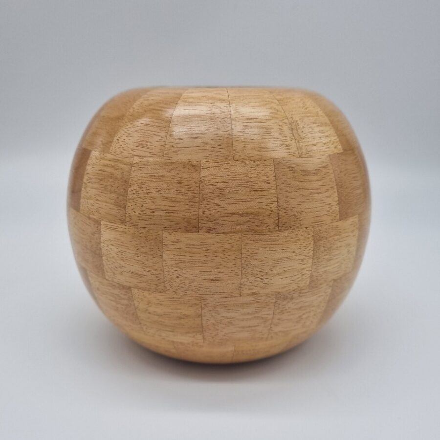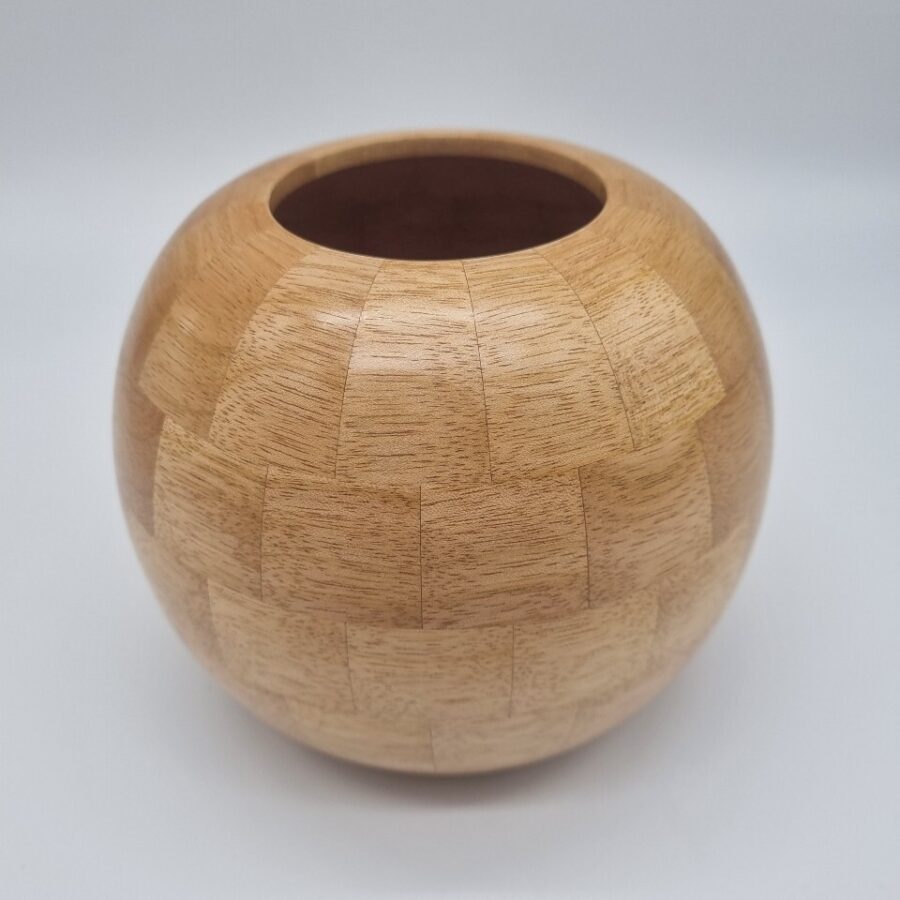 A beautiful ash segmented vase finished with Danish oil and then polished with wax for a deep long lasting shine.