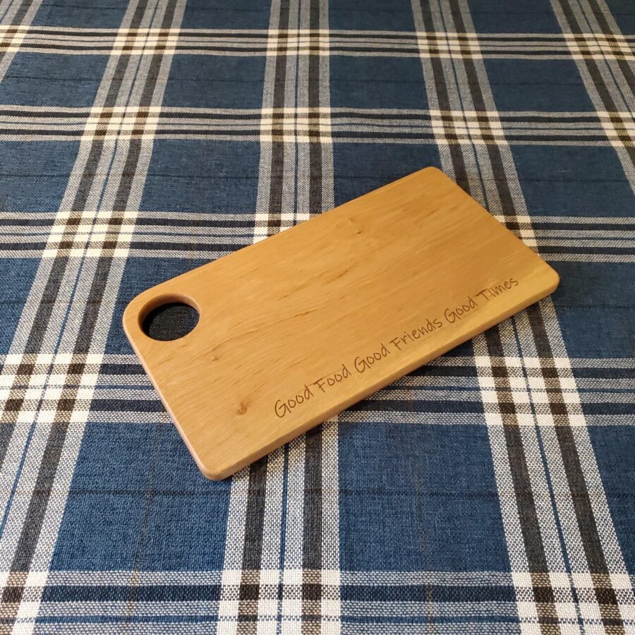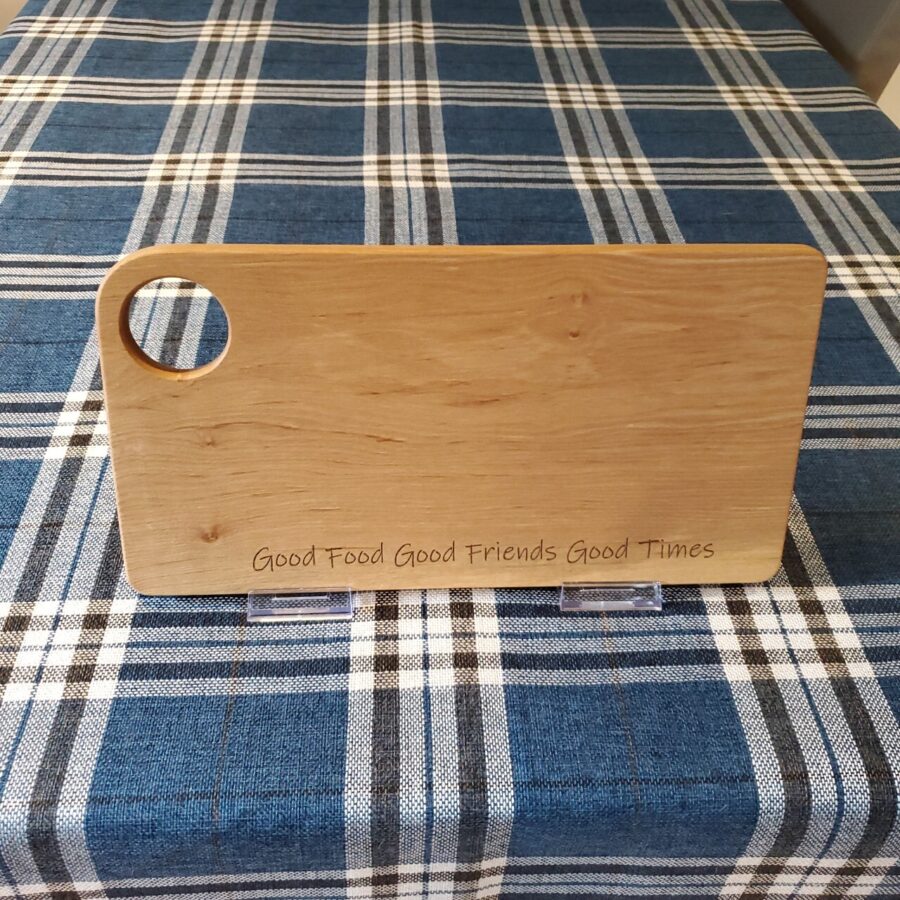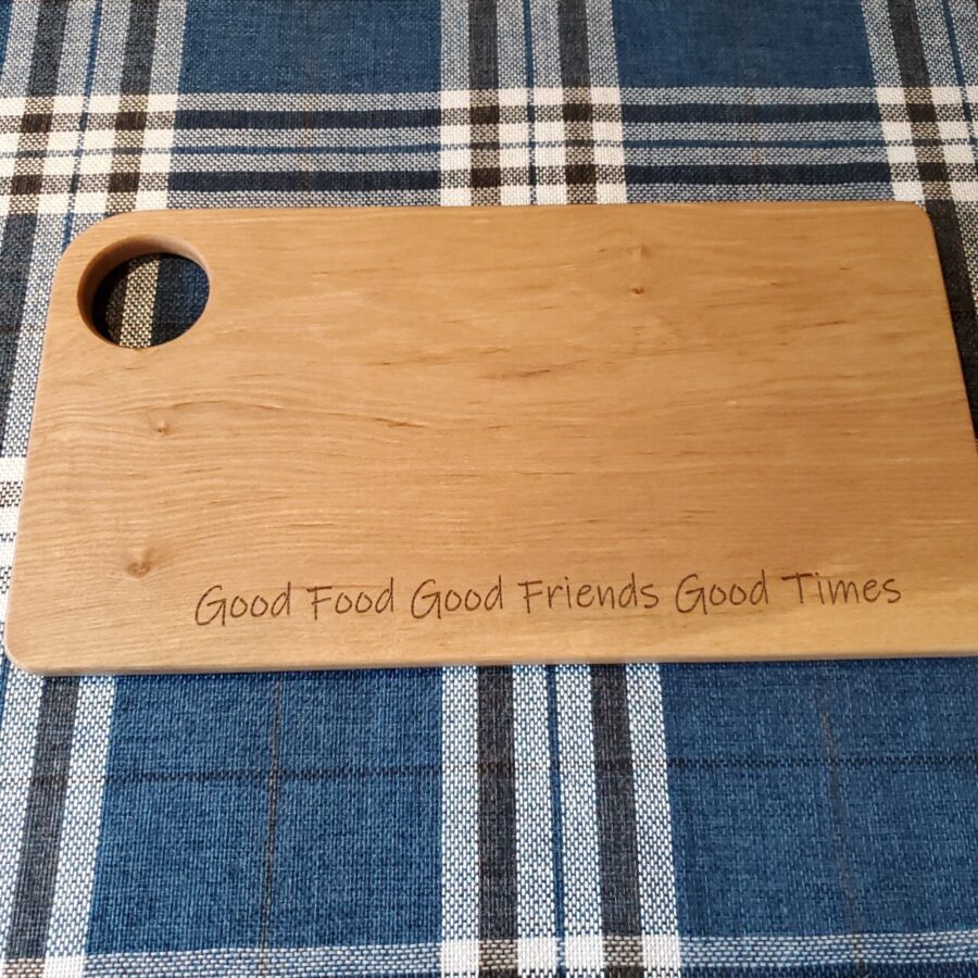 A beautiful serving platter made from ash. Ideal for serving meats, cheeses, biscuits and other treats. It has a carefully positioned hole to enable the easy carrying of the platter. The hole can also be used to hang the platter for storage when not in use. Finished with mineral oil and a final application of a food safe oil/wax treatment. Engraved with "Good Food Good Friends Good Times" slogan. Can be paired with the small Charcuterie board to make a unique and stylish set. As wood is a natural product grain pattern will vary from piece to piece