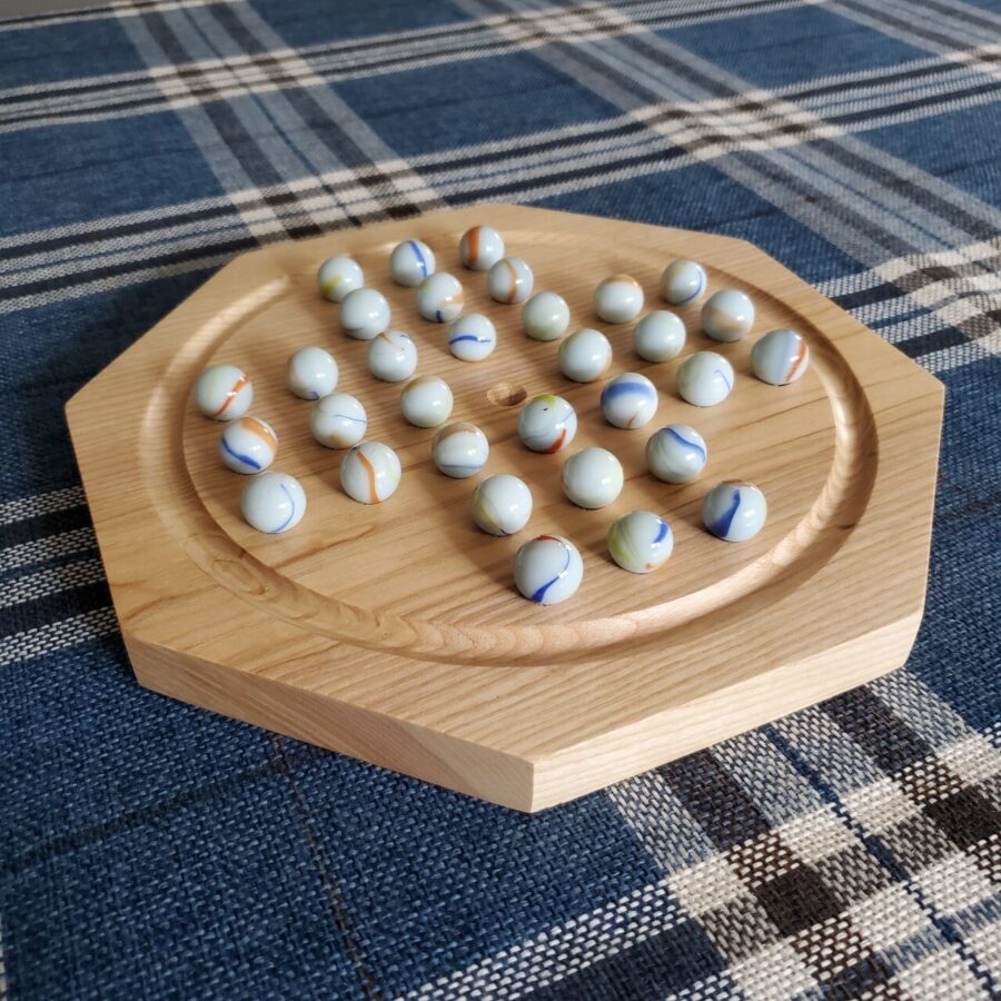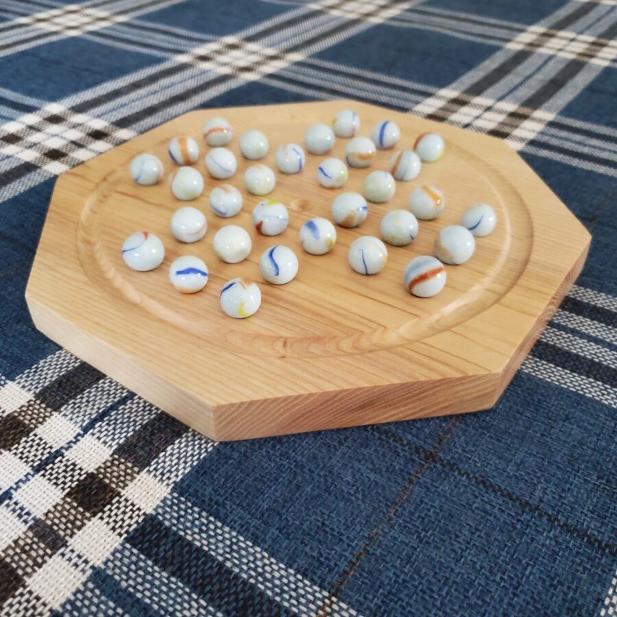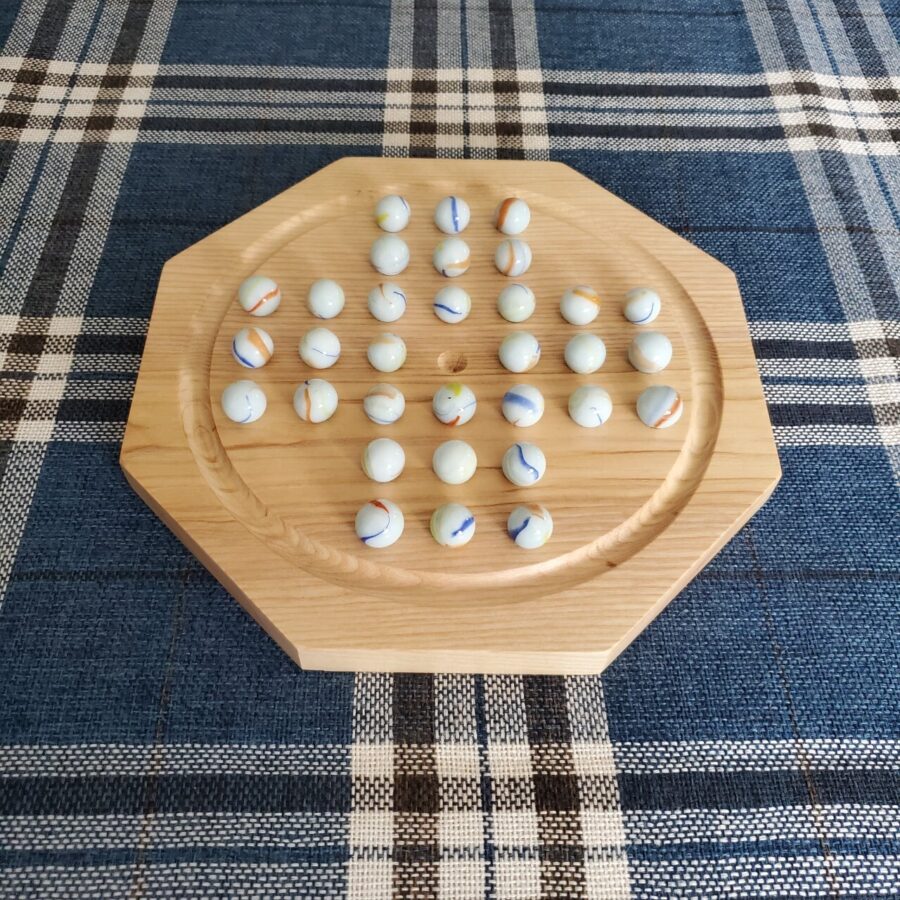 This classic solitaire game is handmade from ash in an octagonal shape. Collection groove around edge to store marbles removed during game. Supplied with marbles and finished with a toy safe wax