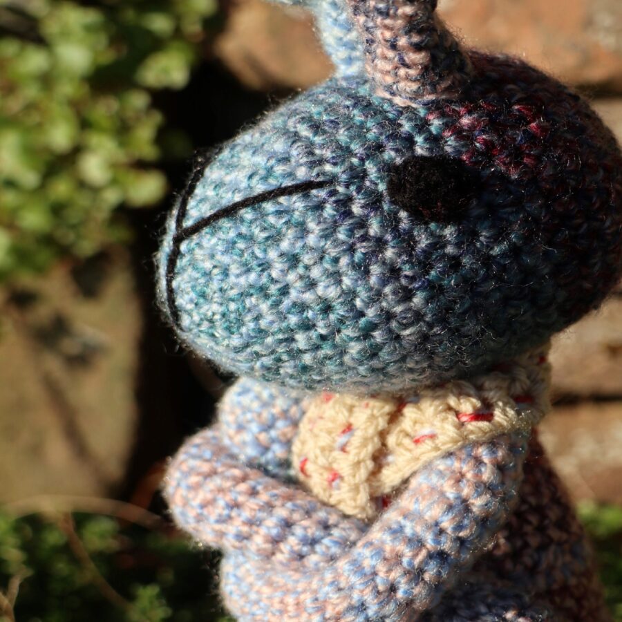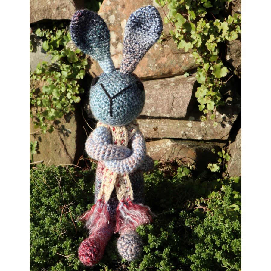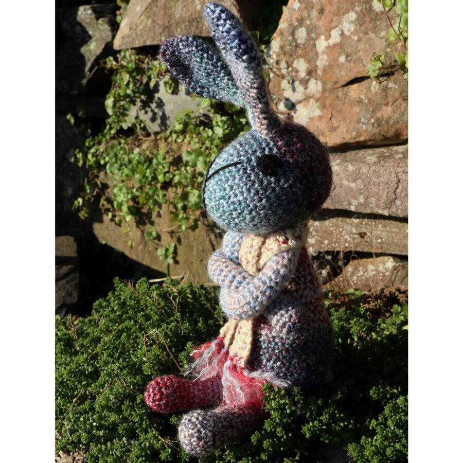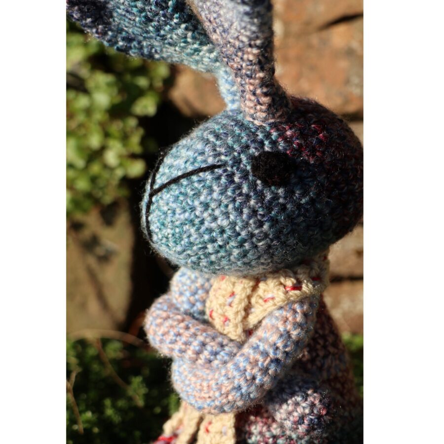 “Beathan ” means "life". Beathan is crochet in a lovely variegated pink/brown acrylic yarn, has crochet black eyes and wears a long scarf. Each bunny is unique in name as well as colours. Beathan is 45cm tall and can sit upright by herself.
