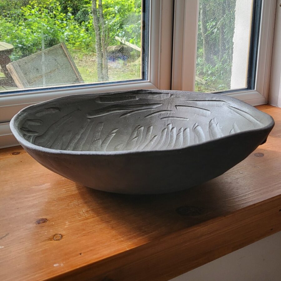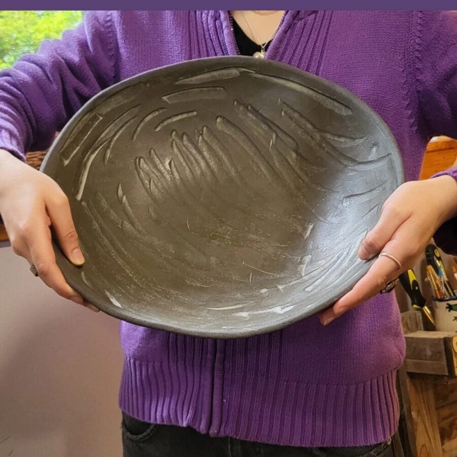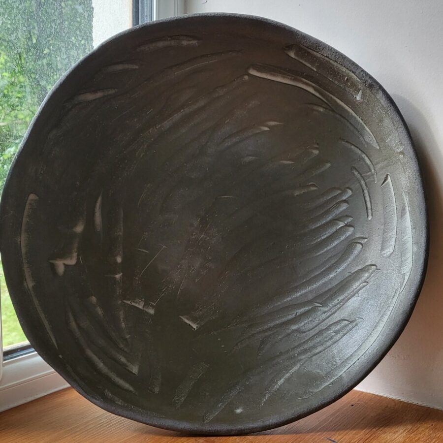 A beautiful large black stone bowl/serving platter with a green tea satin glaze.
