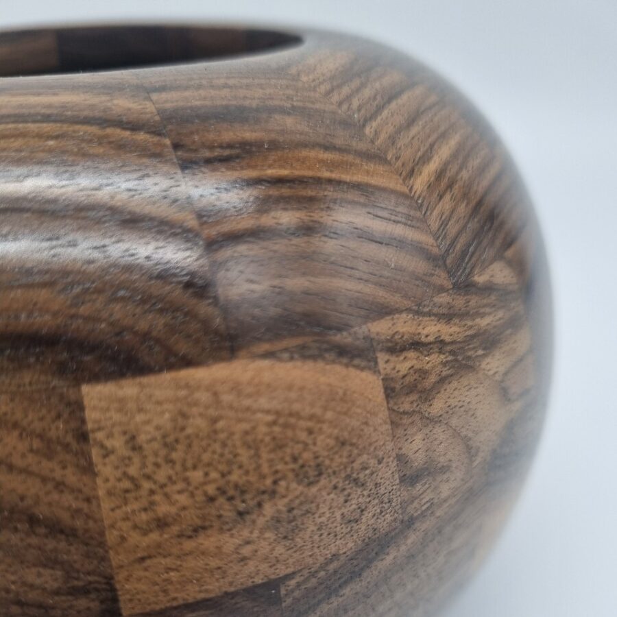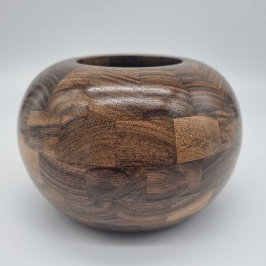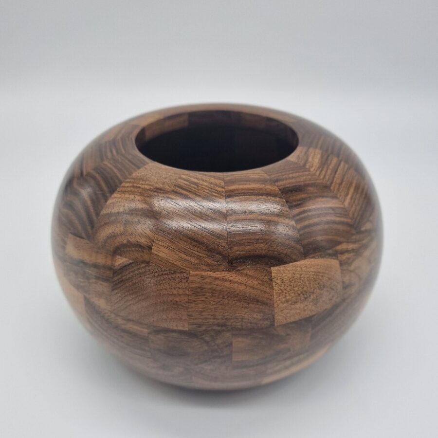 A beautiful black walnut segmented vase finished with Danish oil and then polished with wax for a deep long lasting shine.