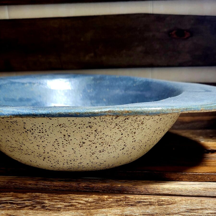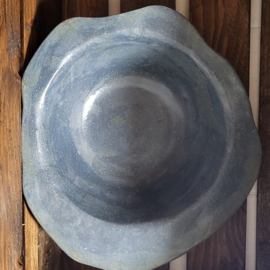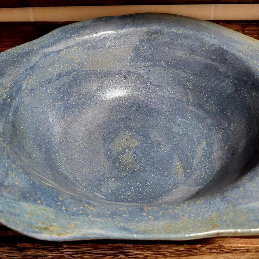 A large freestyle blue bowl in speckled stone with a satin glaze.