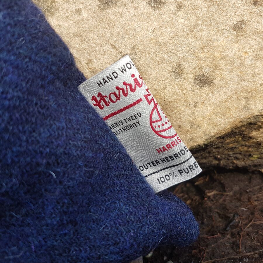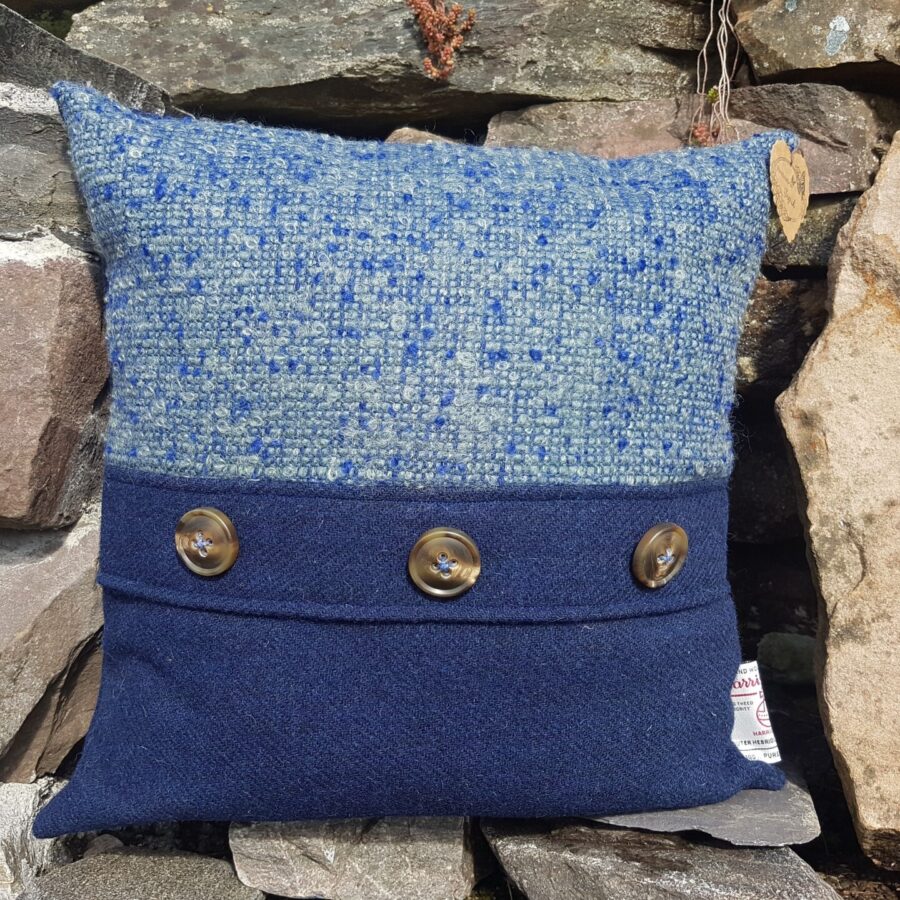 A beautiful blue Harris Tweed cushion with a blue bouclé panel on the front. The front is also embellished with 3 buttons. The back has a deep envelope style opening in the same blue Harris Tweed as on the front. The Harris Tweed Authority's Orb label is sewn into the side of the cushion. All seams are zigzag stitched to prevent fraying. This cushion would make a great accent cushion or a unique gift.