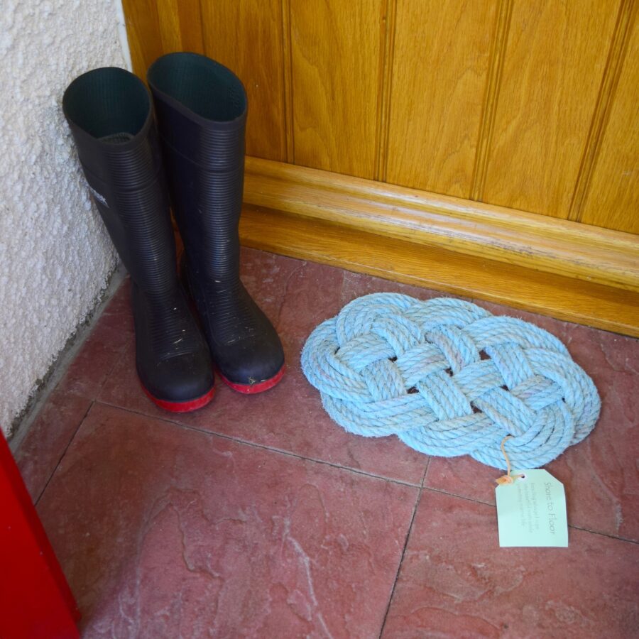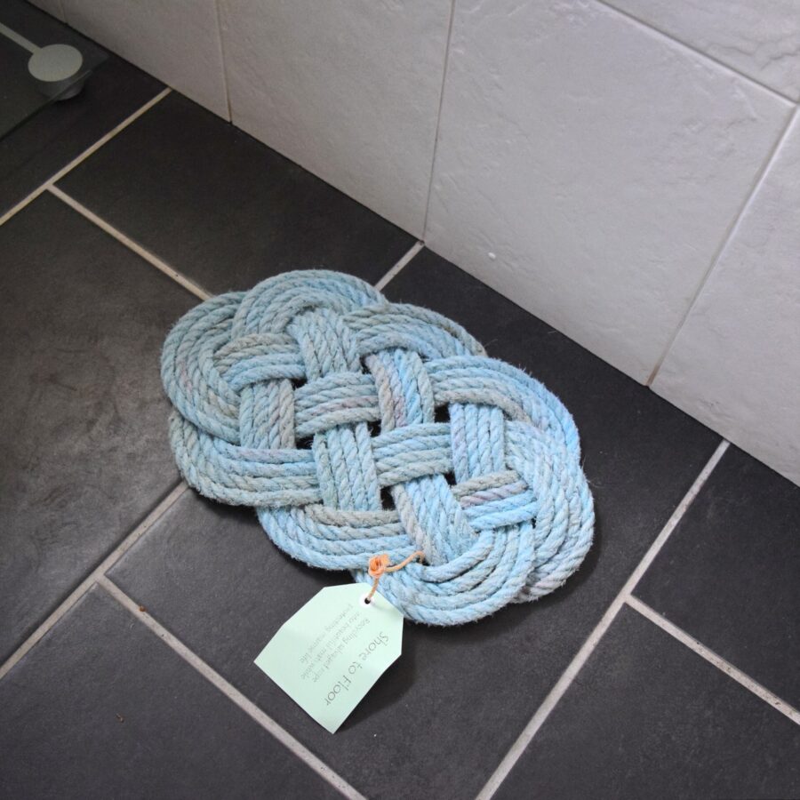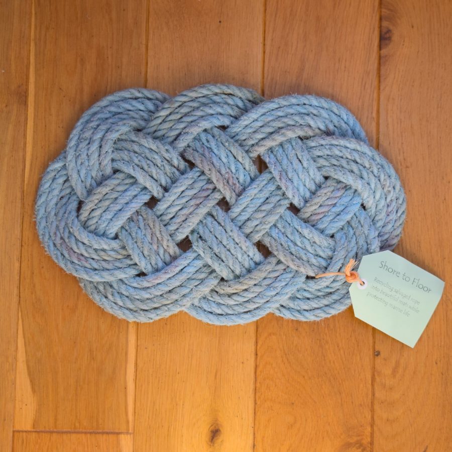 An ocean mat handmade from reclaimed rope salvaged from Caroy Beach, Isle of Skye. Blue soft rope. Well-worn at sea.