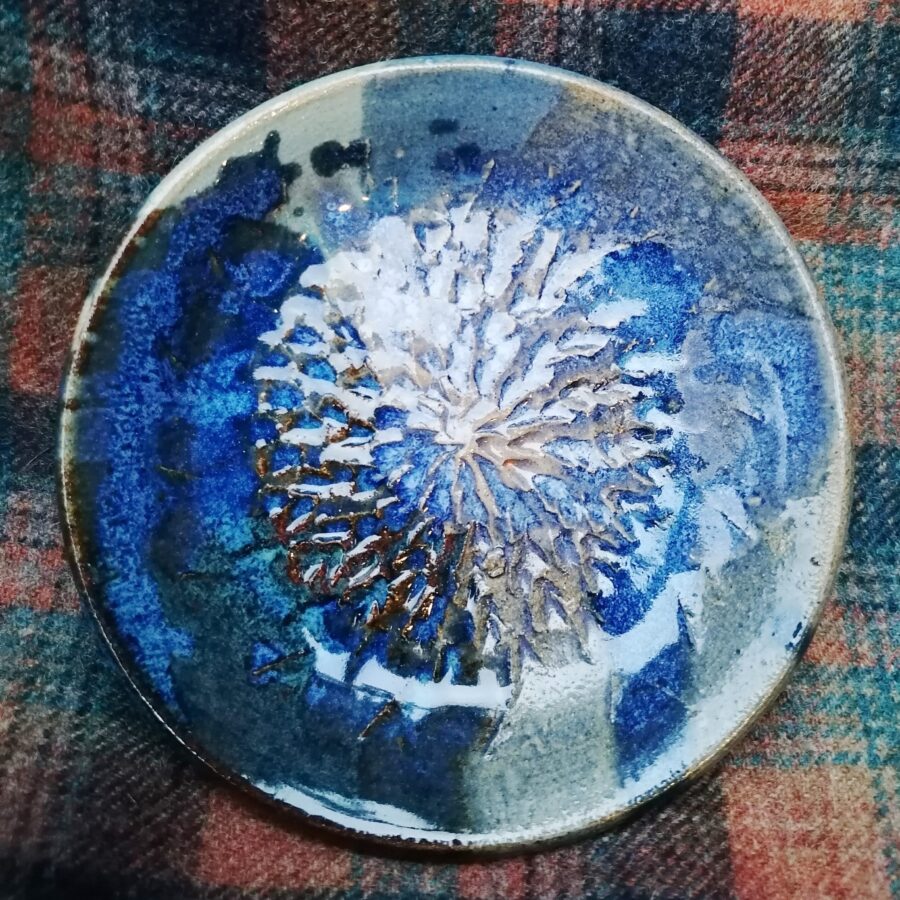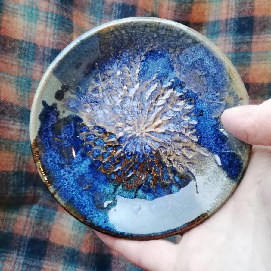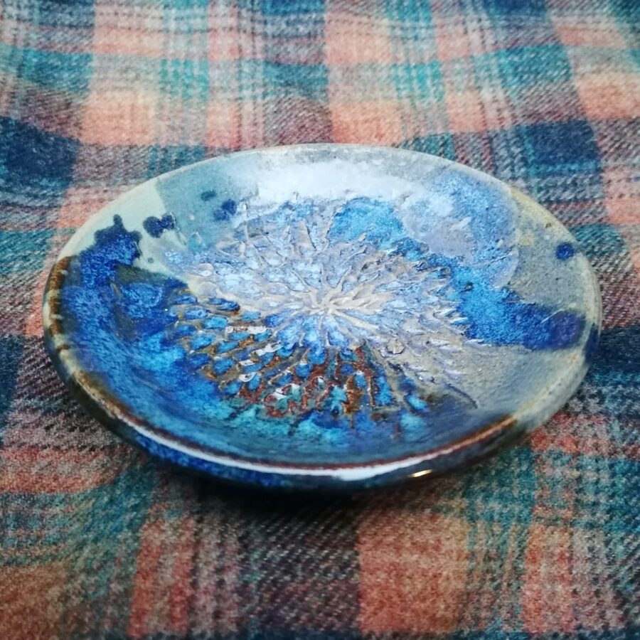 A small stoneware garlic and ginger grating plate in blue colours. Hand thrown and carved on the wheel. Food safe. Dishwasher and microwave safe.
