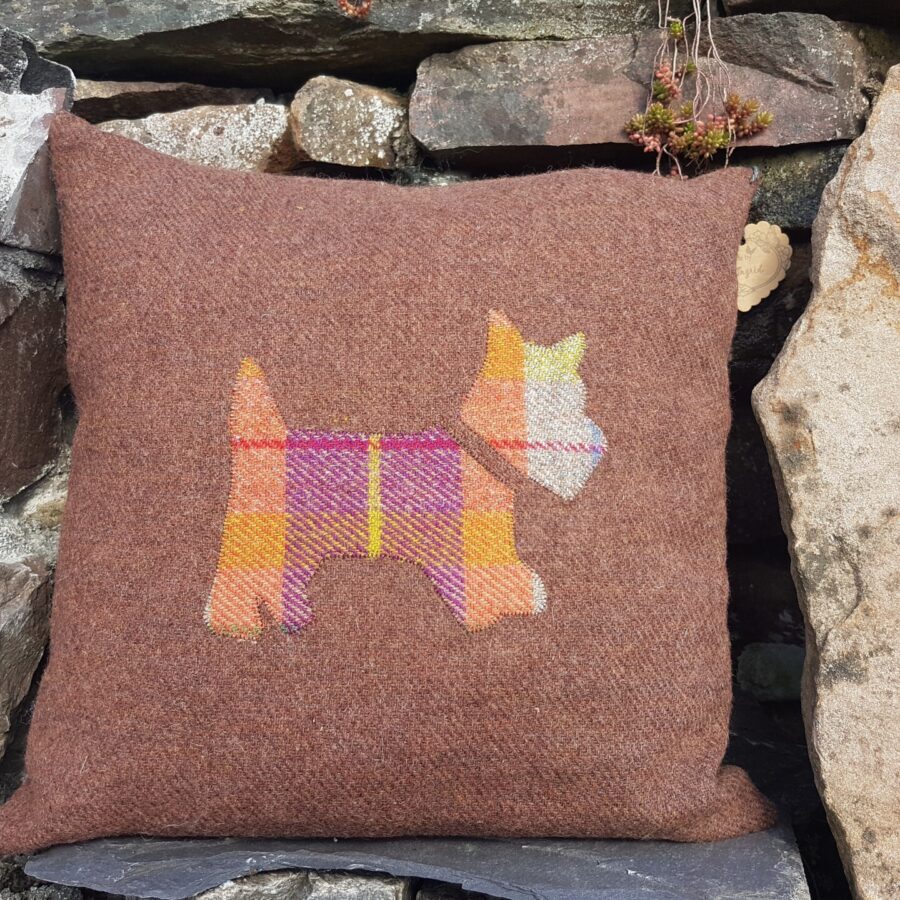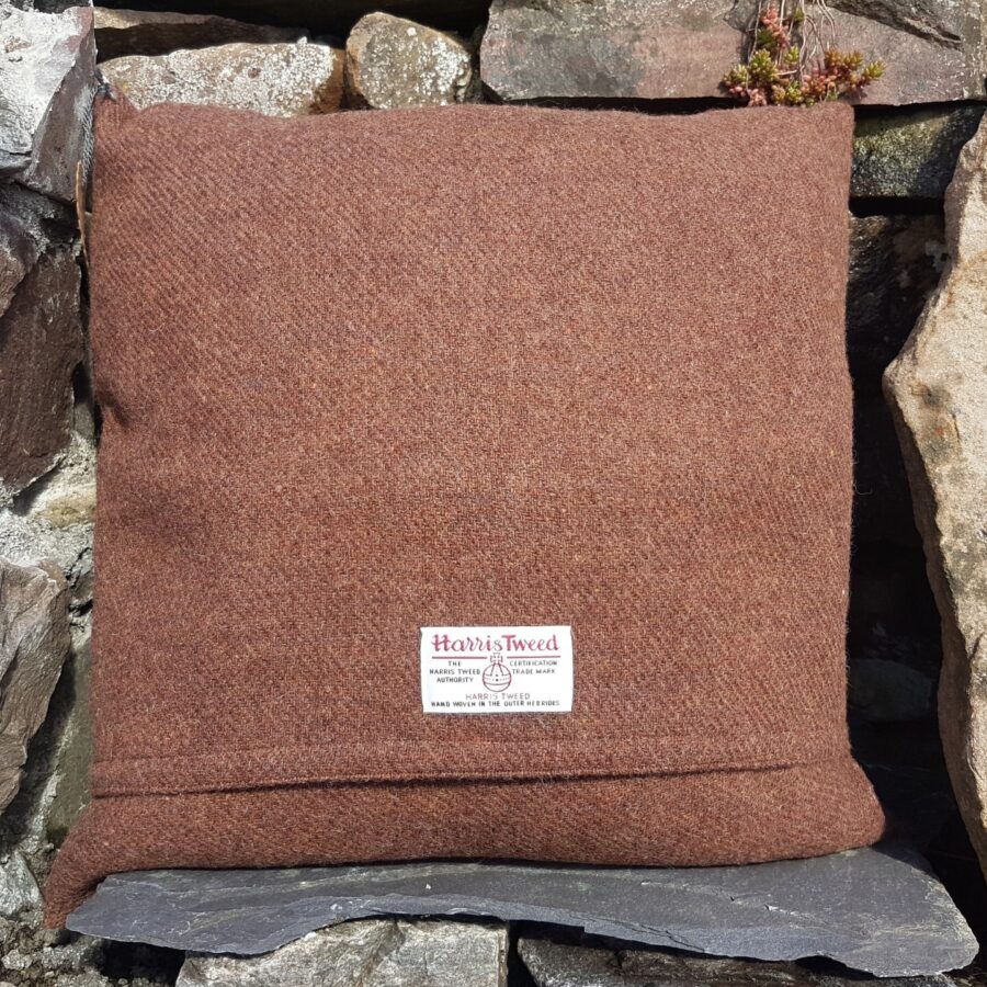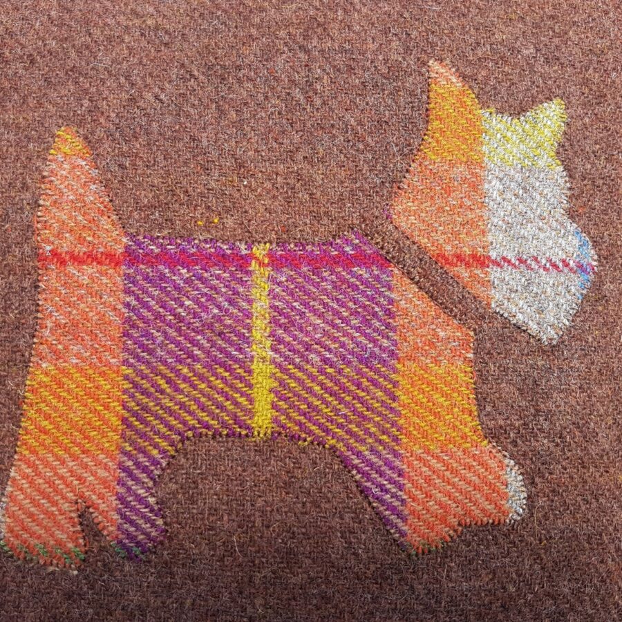 A beautiful brown Harris Tweed cushion with contrasting Harris Tweed scottie dog appliqué on the front. The back has a deep envelope fastening in the same brown Harris Tweed as on the front. The Harris Tweed Authority's Orb label is sewn on the back of the cushion. All seams are zigzag stitched to prevent fraying. This cushion would make a great accent cushion or a unique gift.