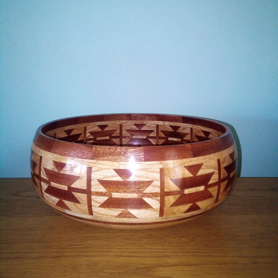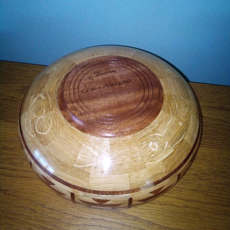 Oak and mahogany butterfly design bowl finished with Danish oil and polished with wax for a gloss finish.